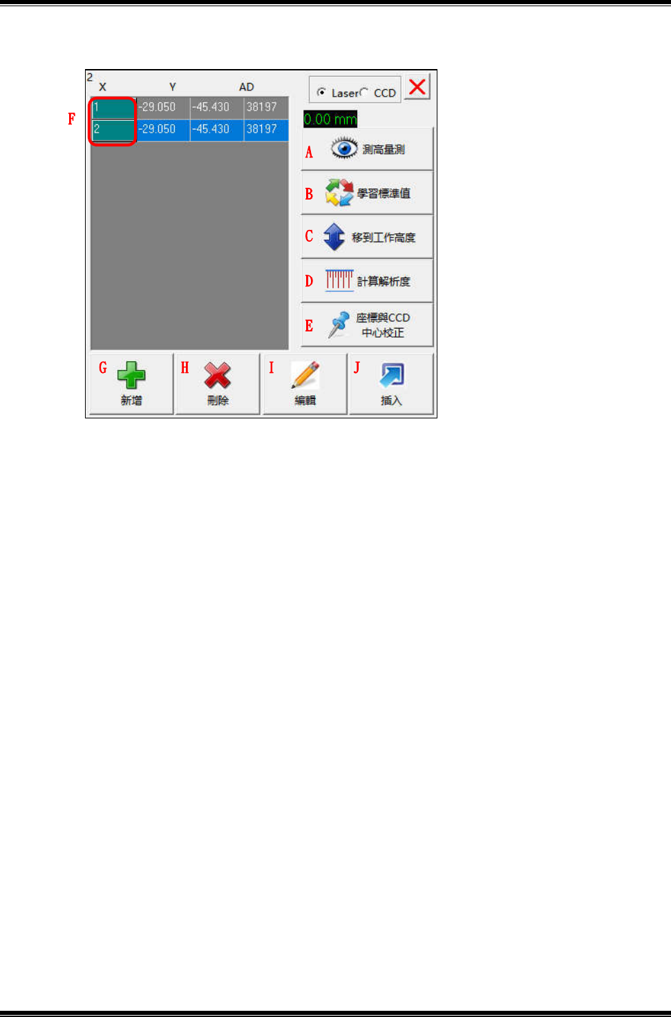 析度;執行此動作時,Z 軸高度需在鐳射量測範圍內,否則有可能超過鐳射位移