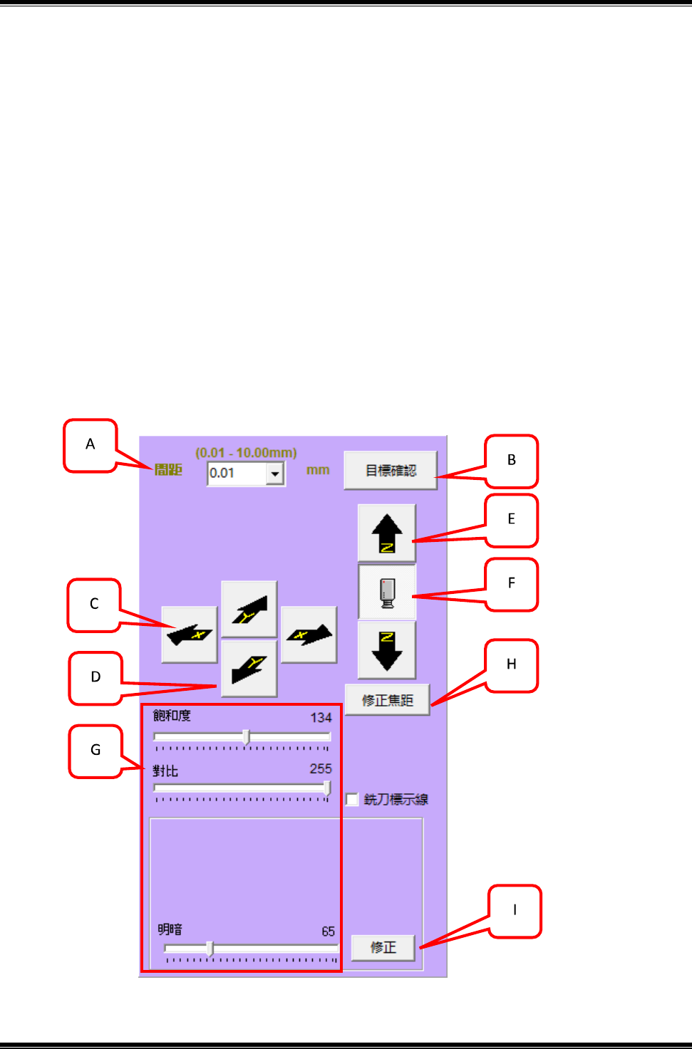 GAM320A 操作說明書 17 (1) 十字中心線:二線交點為影像中心位置 (2) 小十字游標:影像區之滑鼠游標。 (3) 銑刀圓:實際銑刀尺寸對應影像大小。 (4) 方框:相切銑刀圓之邊界。 (5) 滑鼠按鍵: ○ 1 雙擊移動:在影像區任意處連點滑鼠左鍵二次,可將點選處移至影像中 心。 ○ 2 拖曳移動:兩十字間線段,控制影像移動之方向與速度。按住滑鼠左鍵 拖曳移動速度由線段長度控制,放開按鍵則停止移動。 ○ 3 微調盤:滑鼠游標…