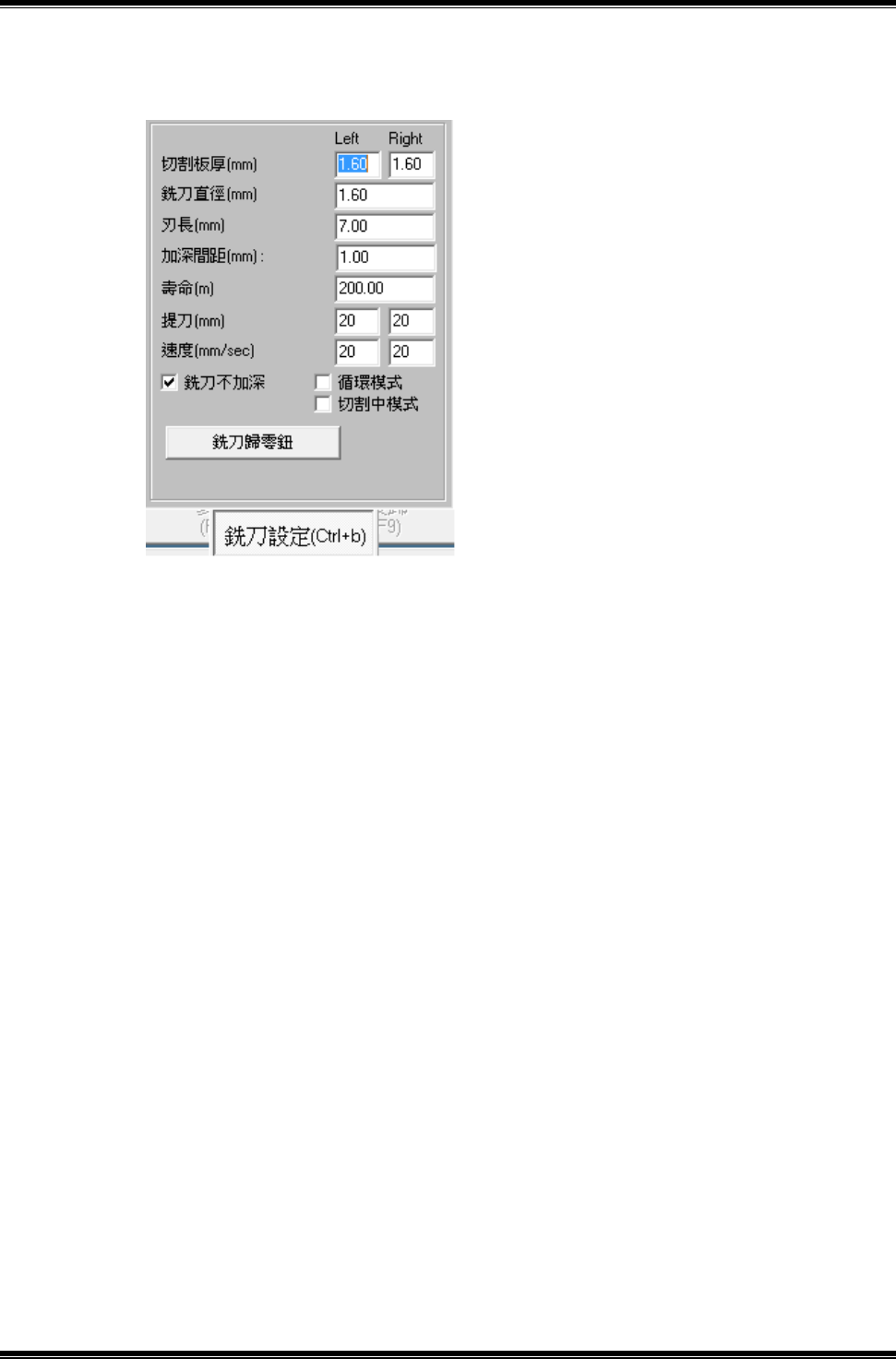 B.銑刀直徑:銑刀之直徑值,選用略小於切縫寬度之銑刀,預設值 1.5mm。