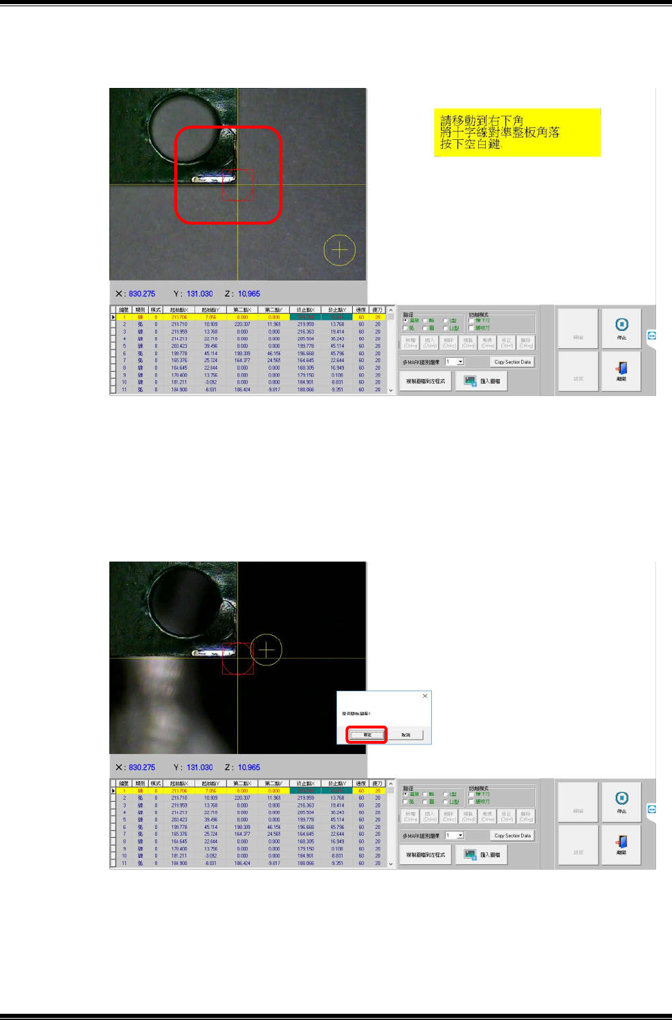 GAM320A 操作說明書 70 ③ 進入整板掃描功能後,點擊”掃描”鍵開始掃描,如圖 6-8-28 。 ④ 將相機畫面移動到整板的”左上角”, 按下空白鍵 , 繼續下一步 ,如圖 6-8-29 。 圖 6-8-29 圖 6-8-28