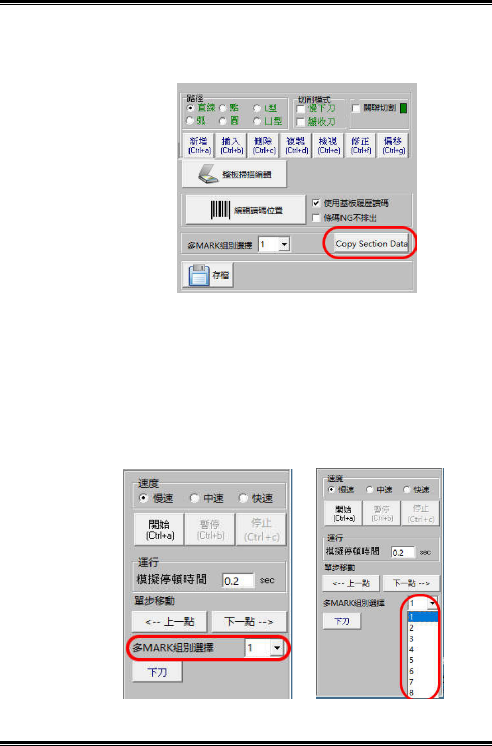*當第一組分板路徑編程完成後,可執行【Copy Section Data】鍵複製