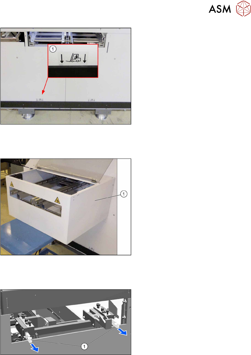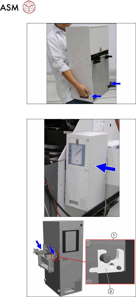 4 设置与调试 4.2 改造 SIPLACE TX 系列贴片机 48 用户手册 SIPLACE TX V1/V2 Series JEDEC Tray Feeder (JTF-ML2) 11/2019 图78: 托住料盘塔 ► 如下所示,通过两个把手托住 SIPLACE JTF‑ML2。 图79: 钩住料盘塔 ► 使用 SIPLACE JTF‑ML2 适配器上的挂 钩钩住料盘塔。 螺栓 (1) 必须位于挂钩 (2) 处。