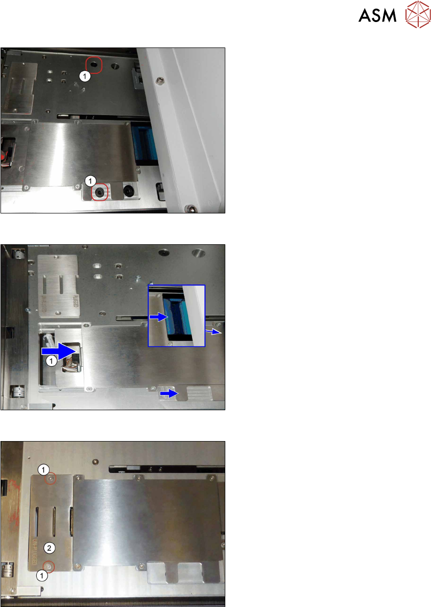 4 设置与调试 4.2 改造 SIPLACE TX 系列贴片机 50 用户手册 SIPLACE TX V1/V2 Series JEDEC Tray Feeder (JTF-ML2) 11/2019 图83: 安装传送导轨 3 ► 拧下传送导轨枢轴 (1) 上的螺丝 (2) 。 ► (3) 将传送导轨枢轴推向料盘塔,直到推 到末端为止。 ► 拧紧螺丝 (2) 。 图84: 安装传送导轨 4 ► 安装传送导轨前,请先将电缆 [03…