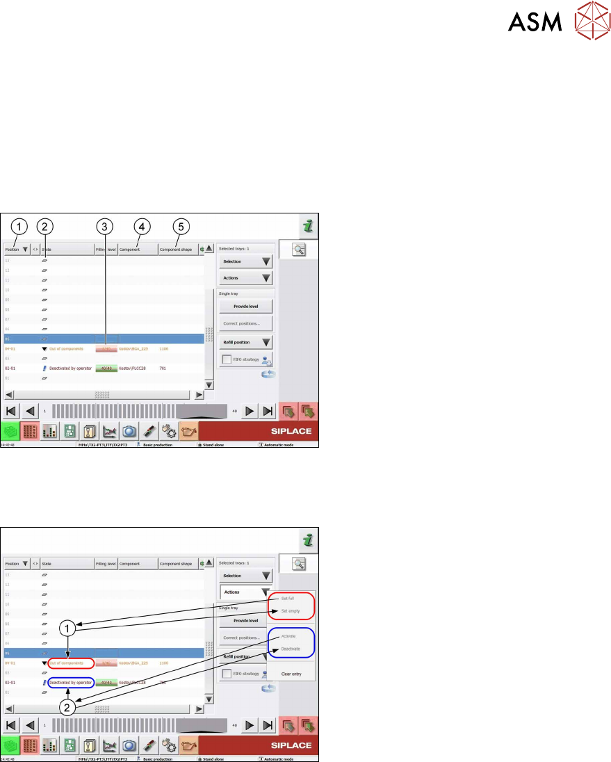 5 在贴片机上执行的任务 5.3 在工作站软件中操作 JEDEC 盘式供料器 84 用户手册 SIPLACE TX V1/V2 Series JEDEC Tray Feeder (JTF-ML2) 11/2019 图151: 功能和操作 1. 选定料盘:以蓝色突出显示 2. 提供料层 :将此级别移至传送位置。 3. 校正位置... :校正拾取位置。 4. 续料位置 :将料盘移回到料盒中,以便 拆卸。在此状态下,不能从任何料盘中 拾取元…
