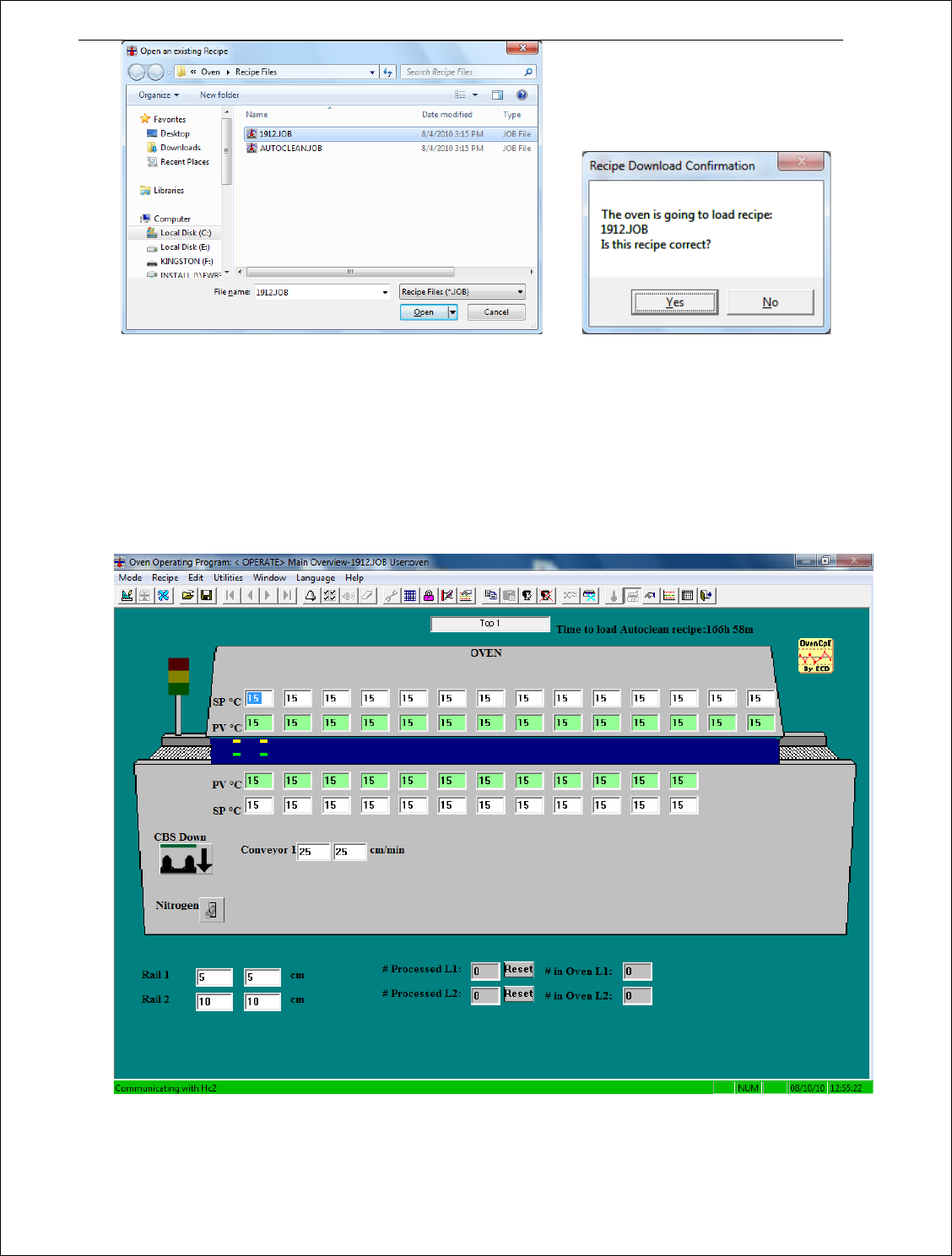 23 图 3 将提示用户确认程序, 选择“是” ,软件将运行 所选 程序 ,并通过主操作界面监视 回流炉参数。 B. 主 操作界面 主操作界面是 Hel ler 回流 炉的图形表示。 根据回流炉的不同配 置,可以显示 许多不同的参 数和 控制 板。 这是程序的中心屏 幕 / 视图, 将在 登录并载入 程序 后出现。 主 操作界面也用 作 程序 编辑器 (参见 图 4 )。 对于 HC2 控制 板,图 4 屏幕 显示“与 Hc 2 通讯”…