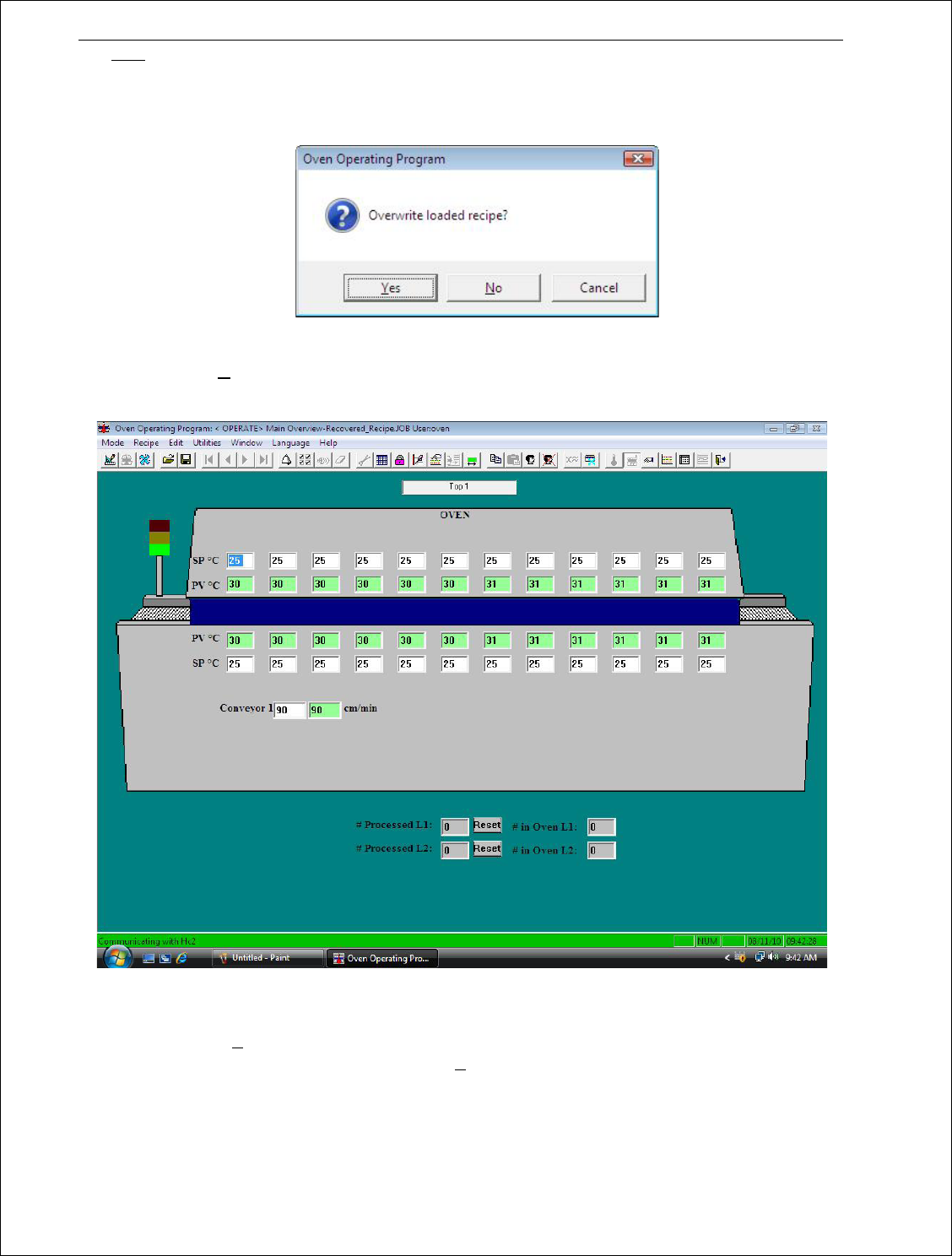 29 警告:不推荐使用“不 关闭退出” 。 如果上次操作选择了 “不关闭退出” 模式,再次 打开应用程序时 ,将询问用 户“覆盖已载入 的 程序” ,参见以下 图 14 。 图 14 点击 “否” ( No ) , 将 提示用户 从控制器恢复 程序。 参见以下 图 15 。 “恢复程序 ”( Recovered _Recipe ) 为通过控制器的已有运 行 程序 。 图 15 点击 “是 ” ( Y es ) , 将提示用户用新的程序 …