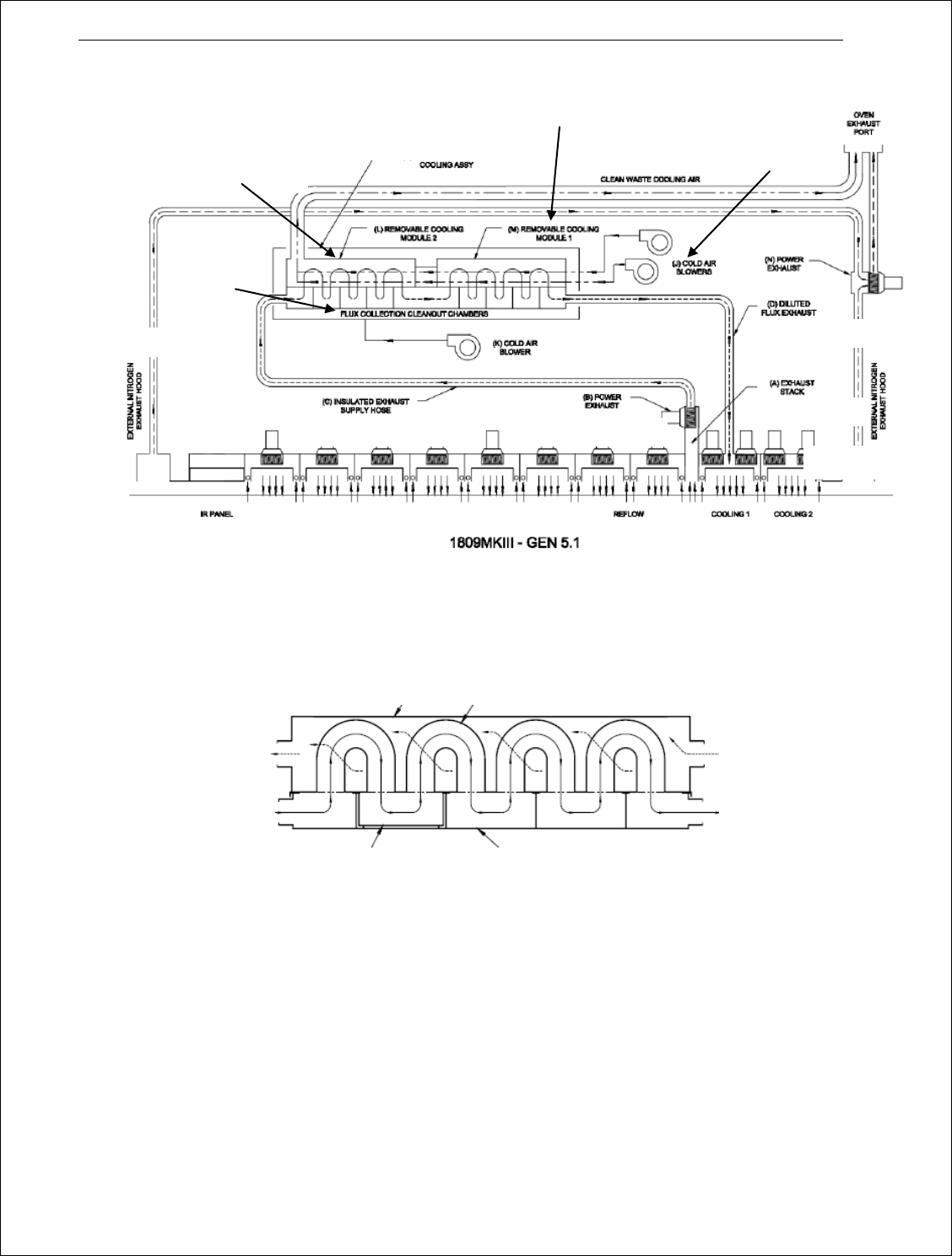 · 安装在顶盖后部内侧的两个外部吹风马达(J)为冷却管外部供应冷却空气。安装在回流炉底架