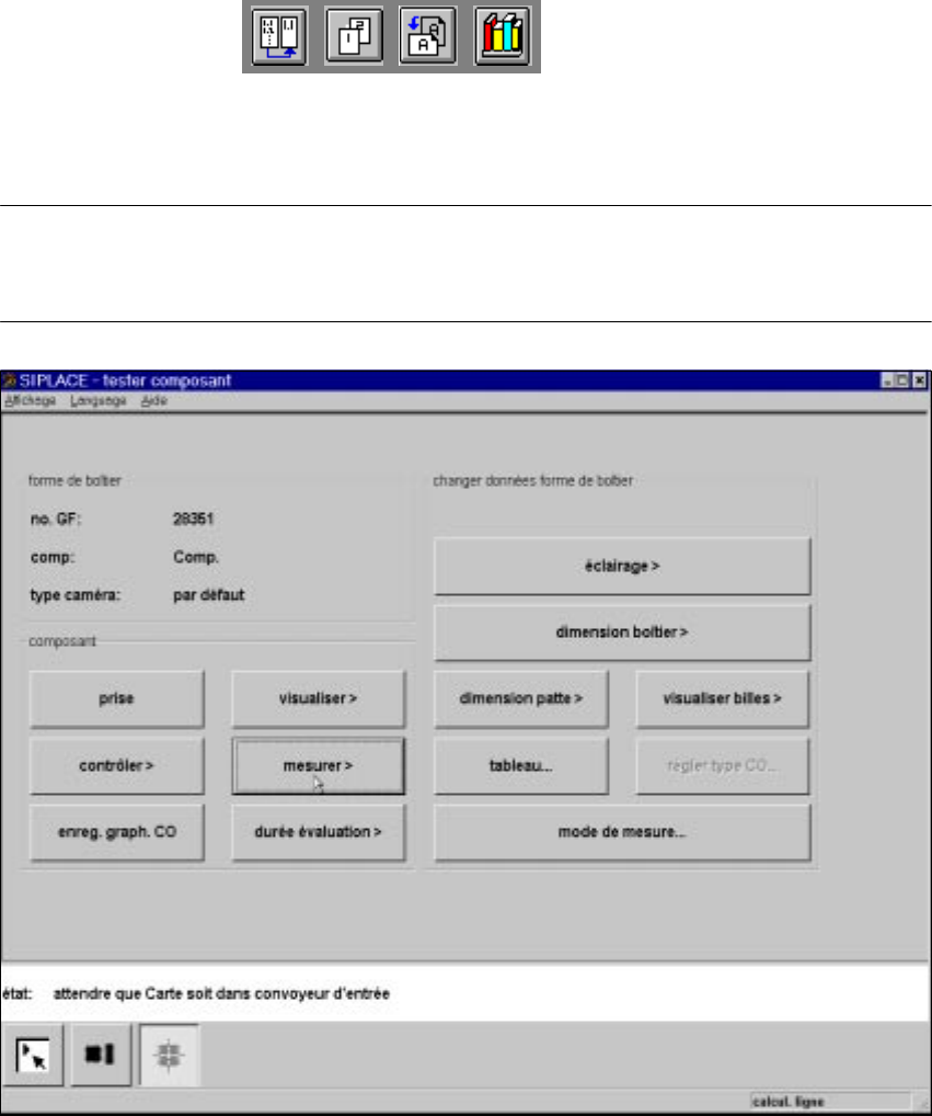 Manuel d’utilisation HS-50 6 Fonctions du système Vision Version du logiciel SR.501.xx Edition 12/99 FR 6.6 Tester c omposant 263 t I I t 6.6.4.4 Option "mesurer" NOTE 6 Avant d’active r cette o ption, veiller …