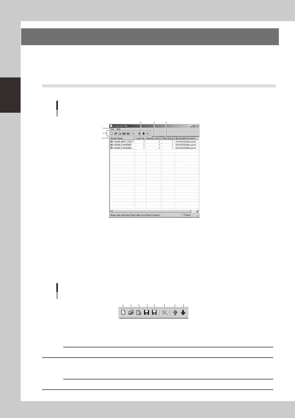 2-66 2 Board Explorer 6. Creating a production plan (plan file) When manufacturing boards of different types continuously , you may want to create a file called “plan file” in which two or more board types and their prod…