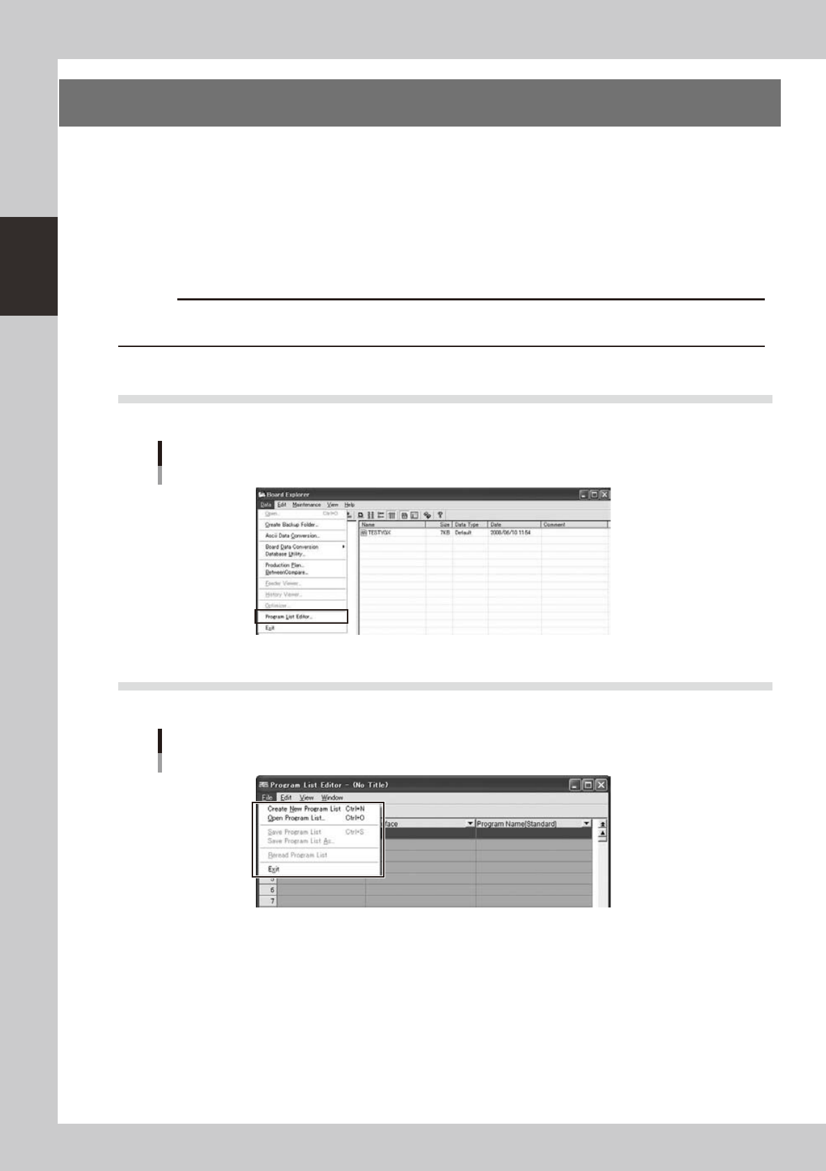 2-77 2 Board Explorer Menu Items Operation Create New Program List Create new program list. When there is the program list being edited now , it is closed. Open Program List Select the program list already registered and…