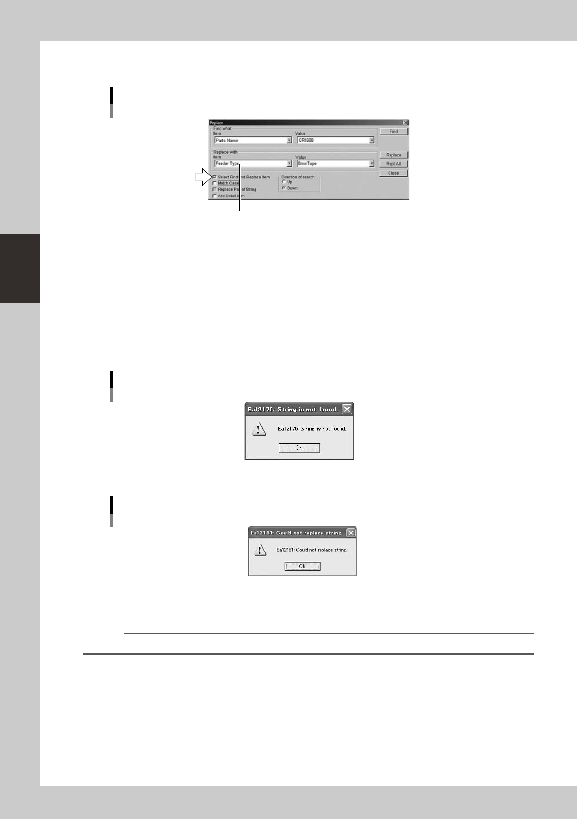 Dialog box displayed if failed to replace a target item
