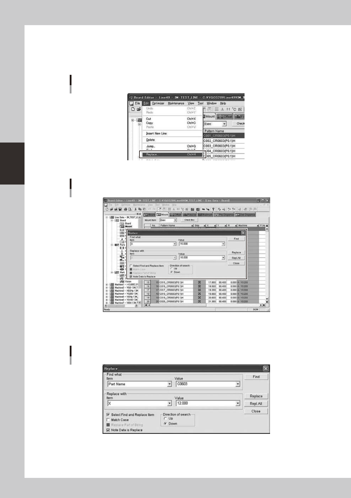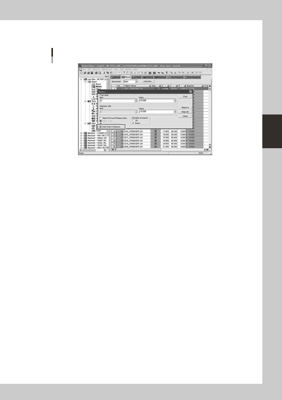 3-35 3 Board Editor 2.10.3 Function of Replacing Data with Note Thefunctionof“NoteDataisReplace”isasfollows. Replace Screen 64360-S0-00 “NoteDataisReplace”checkboxisaddedtotheconventionalreplacedialo…