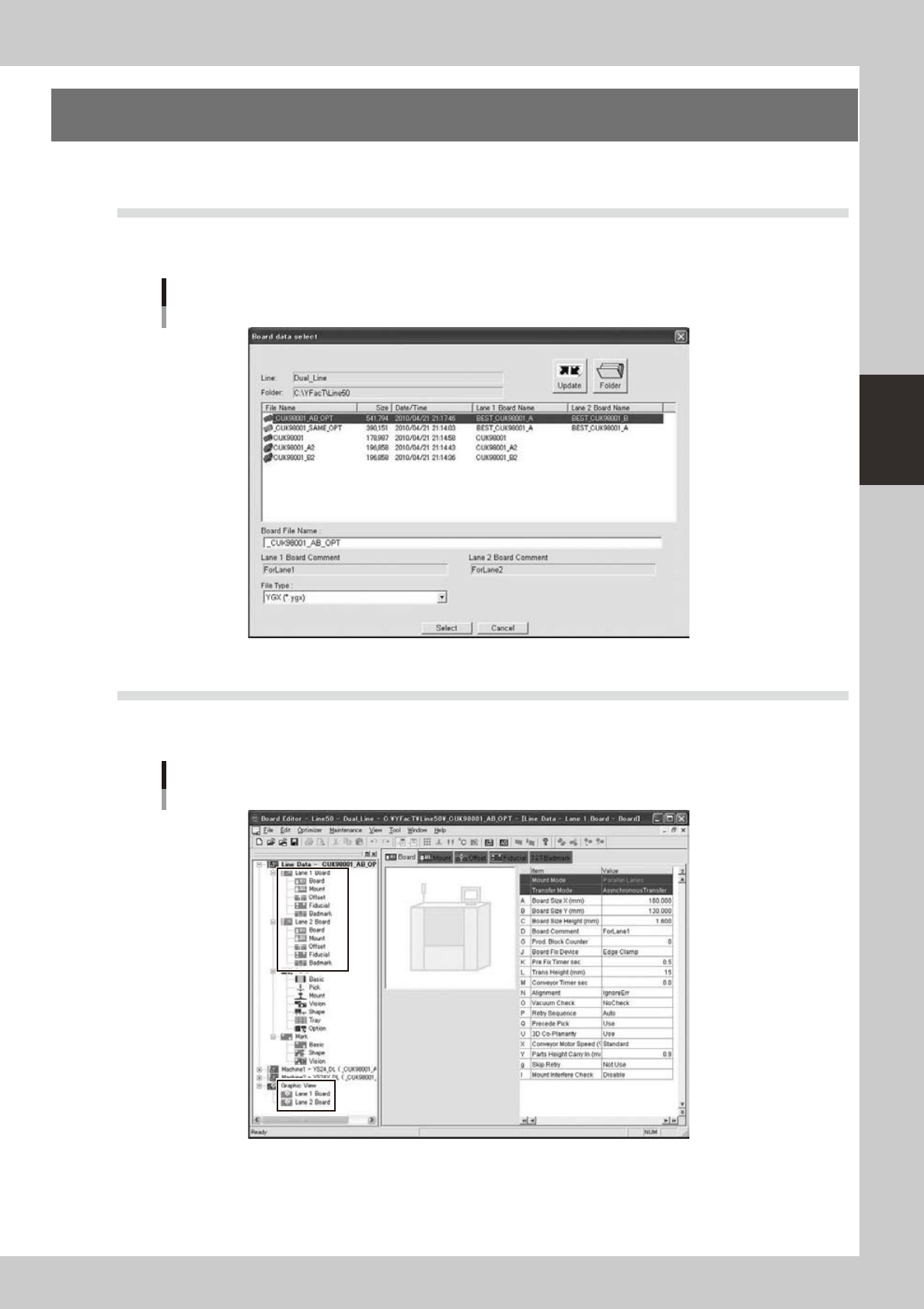 3-51 3 Board Editor 4. Multi Lane Suppor t Additional features supporting the dual lane machine are listed below . 4.1 Board data select dialog is extended [Lane 1 Board Name] [Lane 1 Board Comment] [Lane 2 Board Name] […