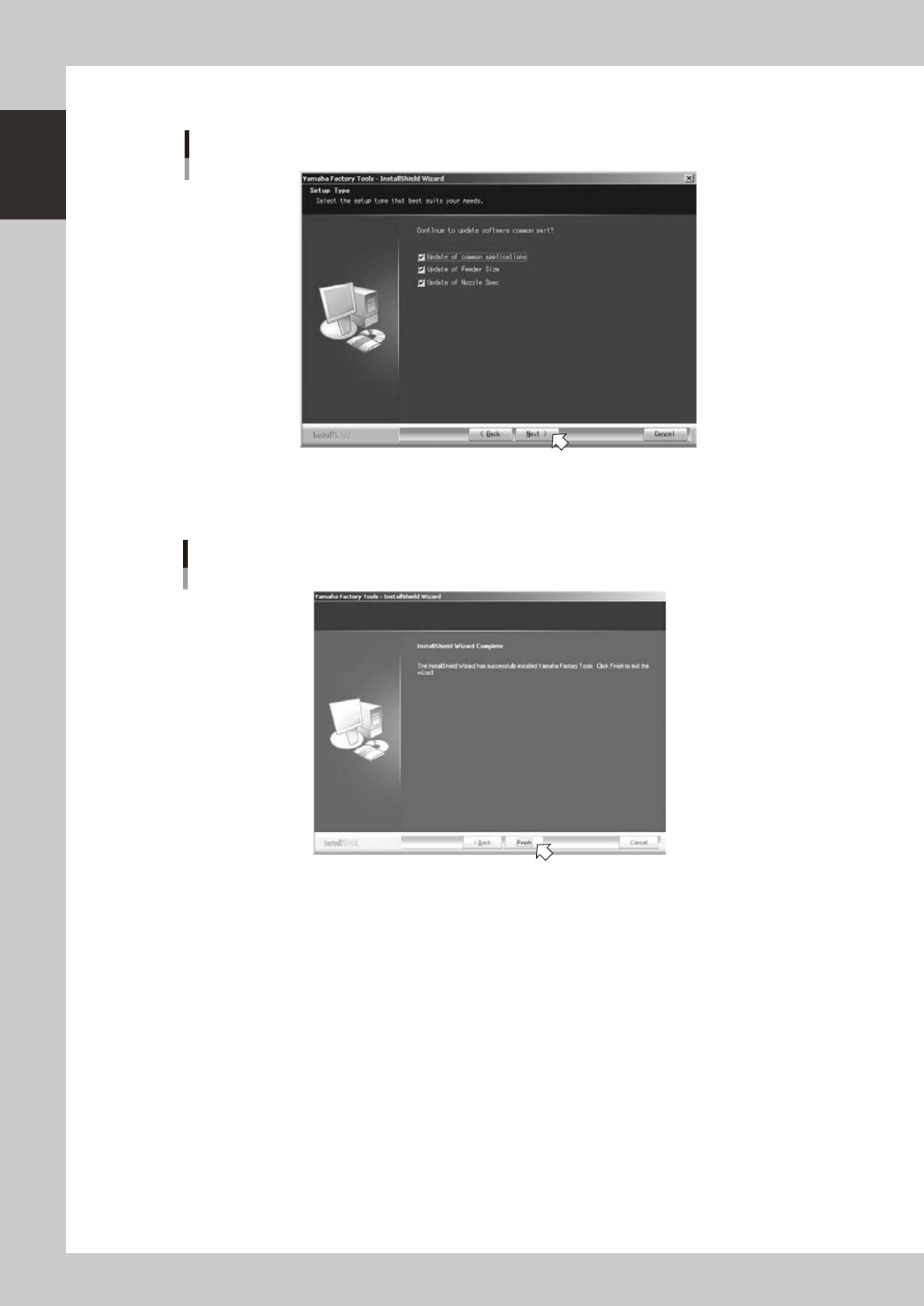 1-6 1 Installation of Factor y T ools 2 Check the update object in the “Setup T ype” dialog and click the “Next (N)” button. “Setup T ype” dialog 64130-S0-10 3 "InstallShield W izard Completed" dialog bo x will…