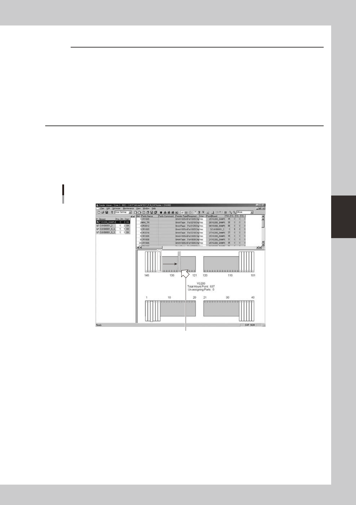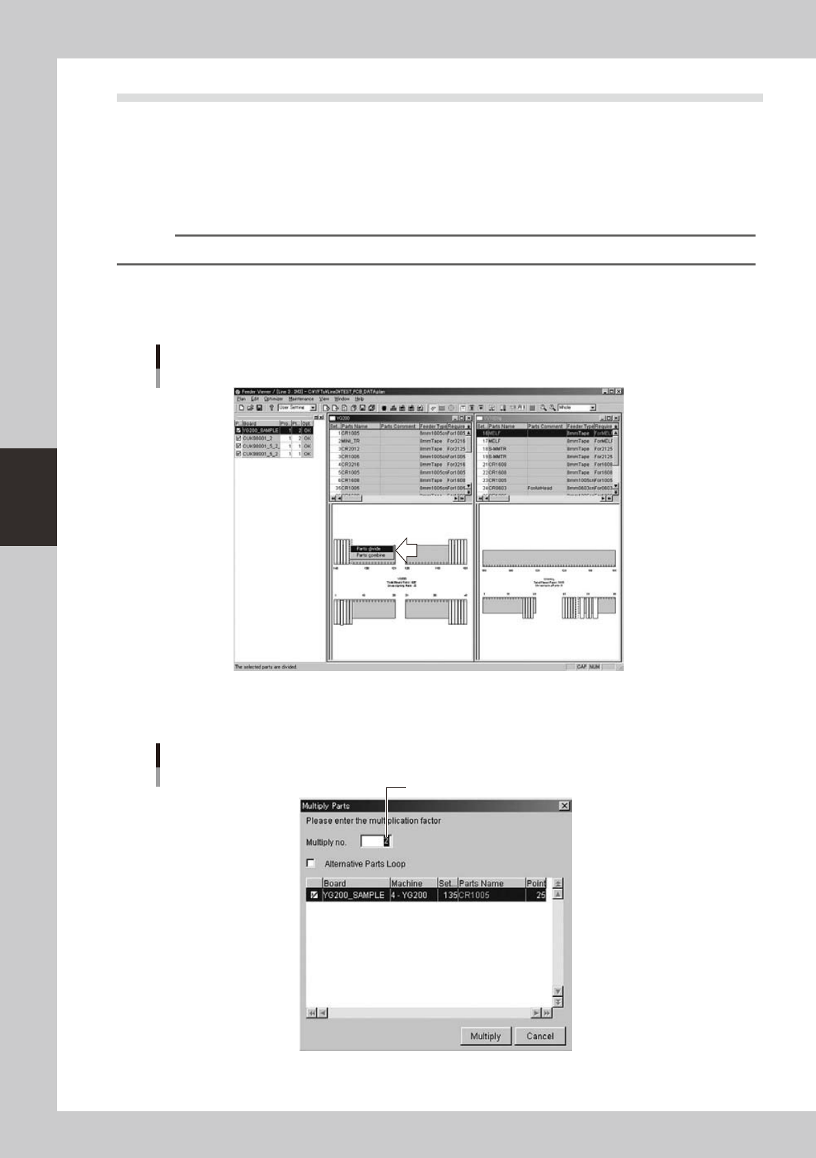 4-34 4 F eeder Vie wer 3.7 Dividing the par ts Parts loaded on one feeder can be divided so that they are supplied from two or more feeders. This will shorten the time required to mount parts on one board when the same t…
