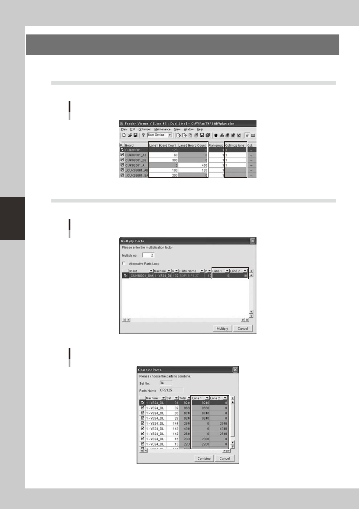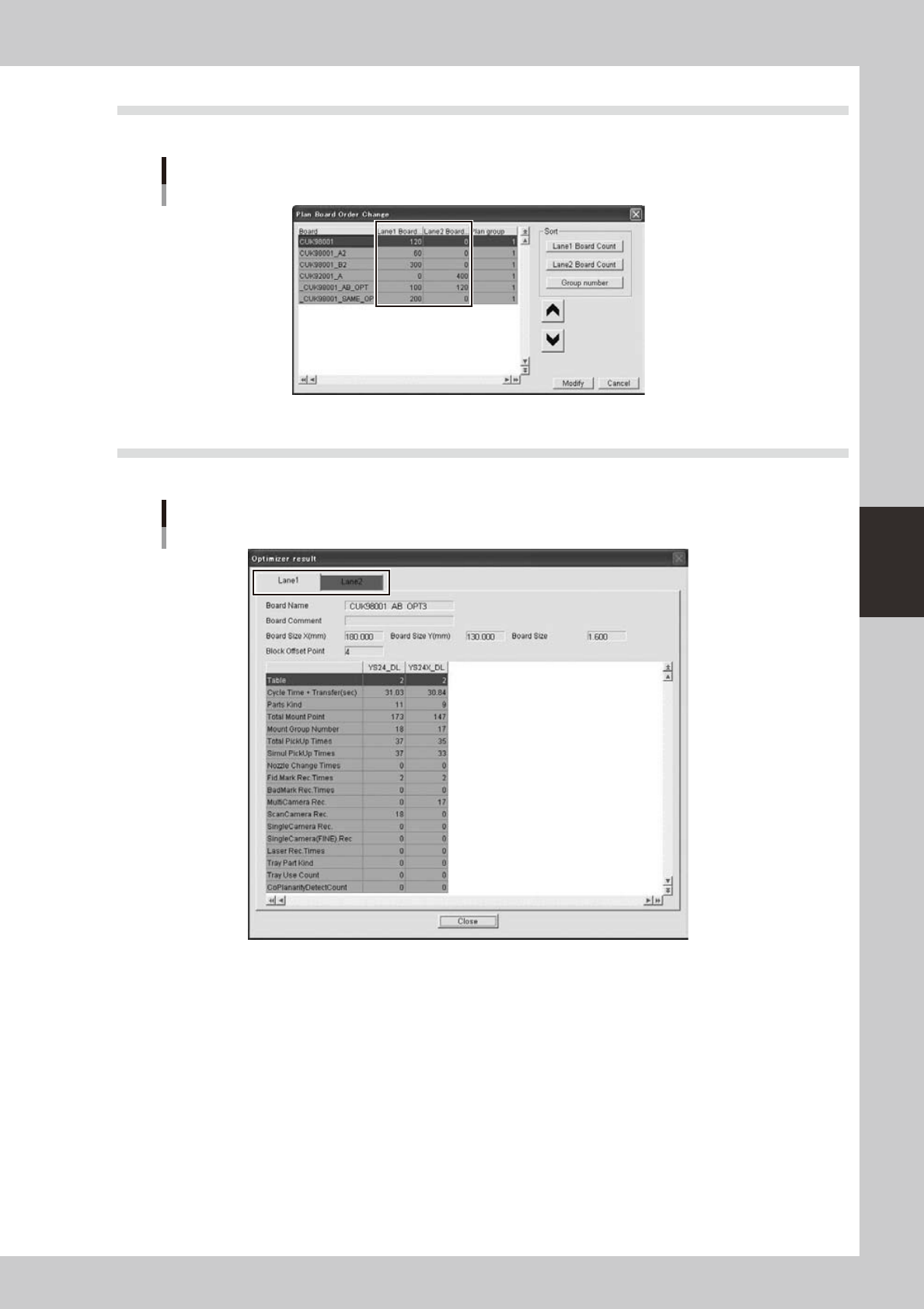 4-50 4 Feeder Viewer 5. Multi Lane Suppor t Additional features supporting the dual lane machine are listed below . 5.1 Production board list is extended It is extended for board count of each lane. [Optimize lane] is ac…