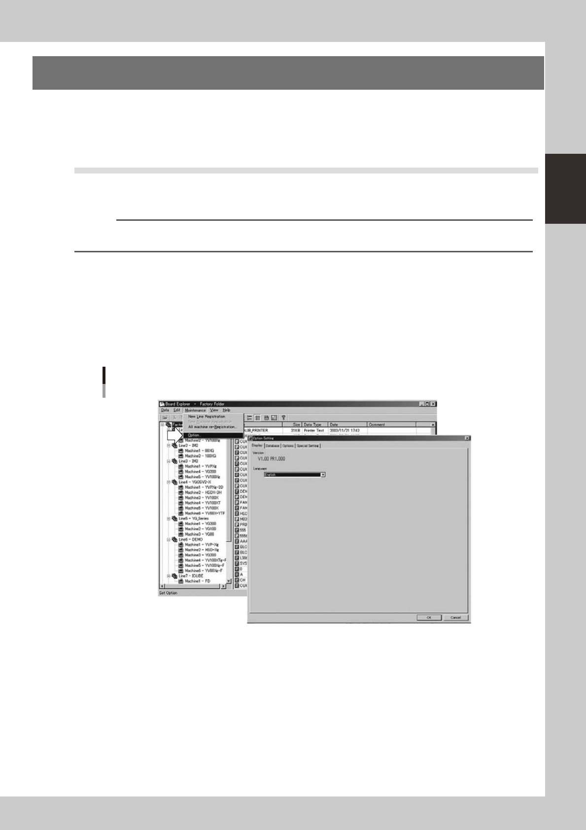 2-18 2 Board Explorer 3.2 Deleting the lines and machines When you want to delete a registered line or machine, select the line or machine and press the right mouse button to display the context menu. T o delete a line: …