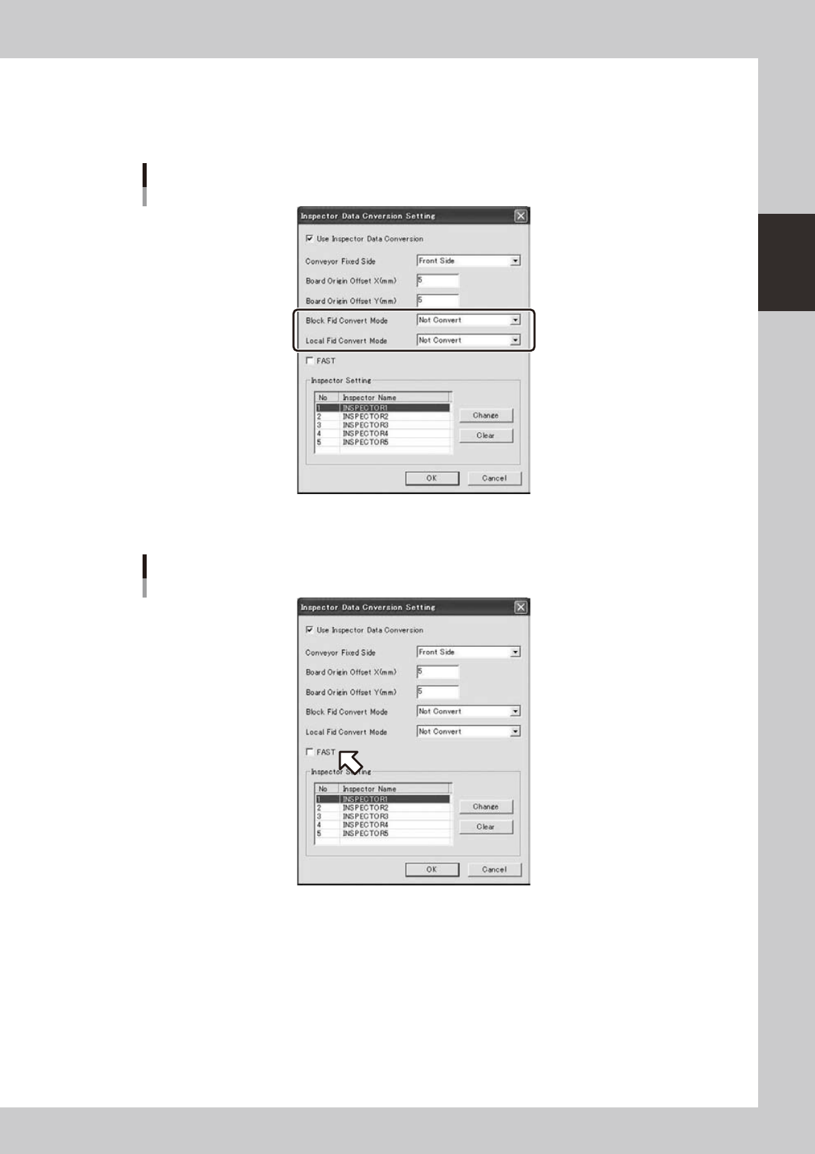 The inspector name set here will be indicated in the "Board data conversion" menu.