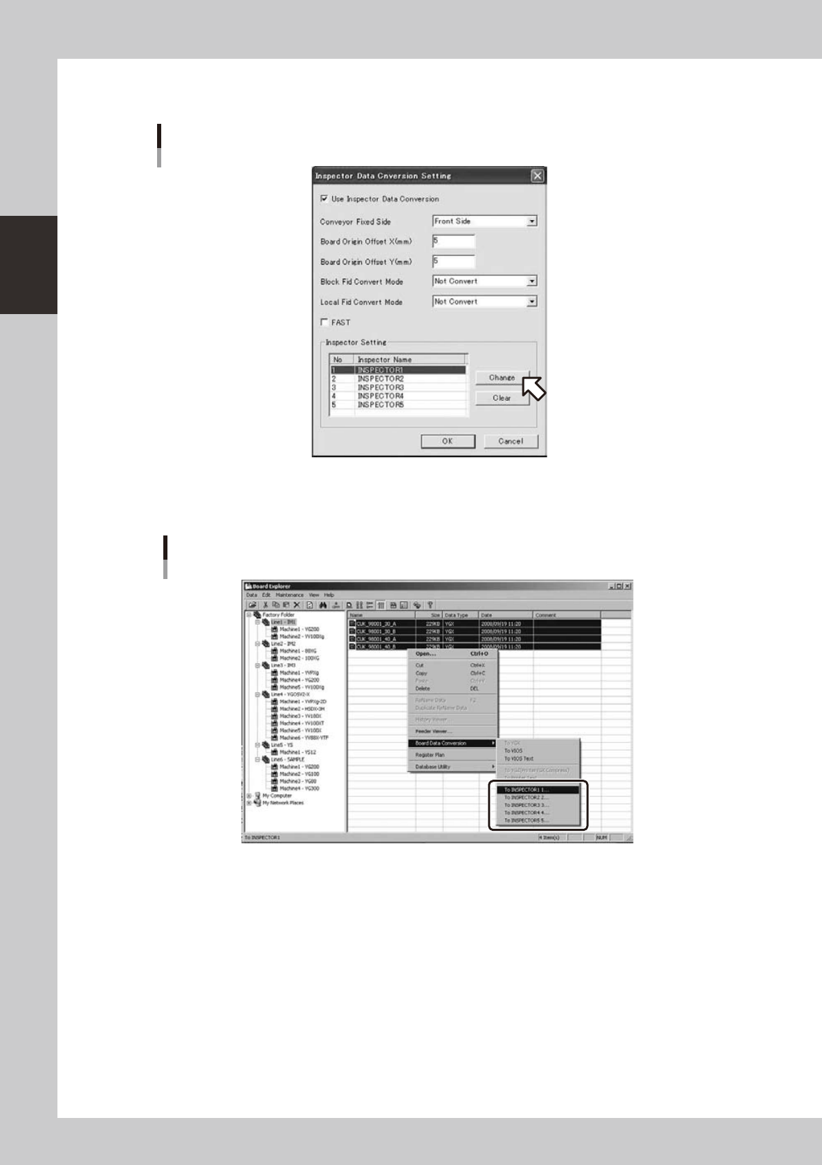 2-38 2 Board Explorer 7 Double-click an inspector name or click the [Change] button to change an inspector name. Change of inspector name 642C6-S0-10 Up to f ive inspectors can be set. The inspector name set here will be…