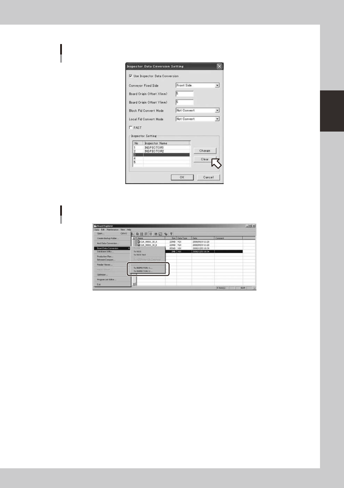 The cleared inspector will not be indicated in the board data conversion menu.