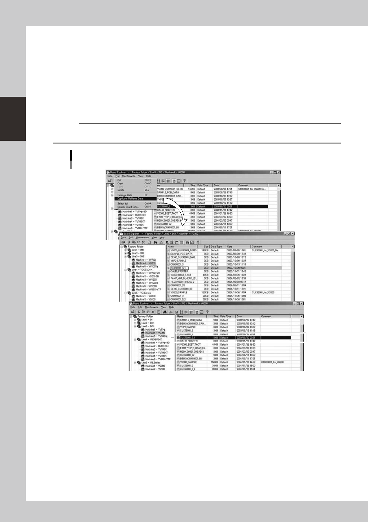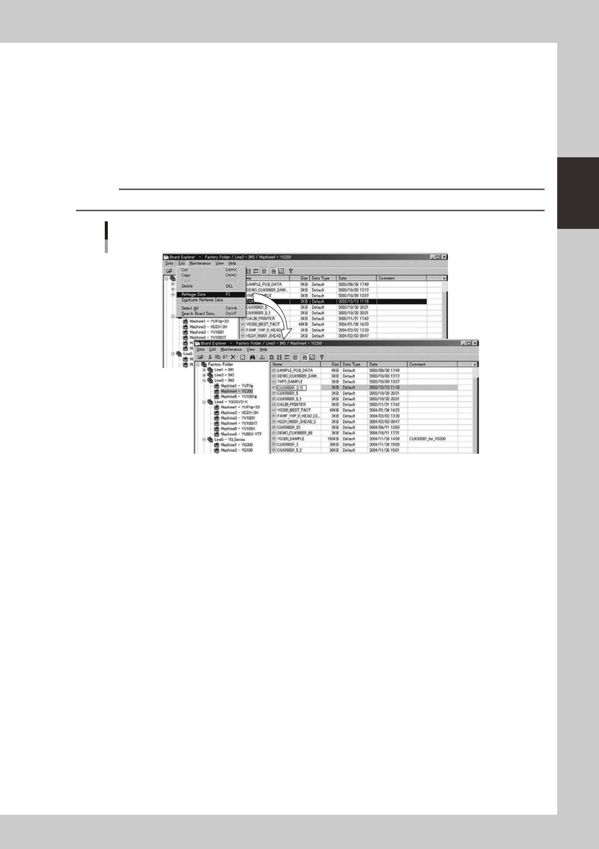 2-45 2 Board Explorer 5.1.2 Renaming board data To rename board data, follow these steps. 1 Select the board data. Select the line or m achine in the tree view s o that the board data to be renamed is display ed in the m…