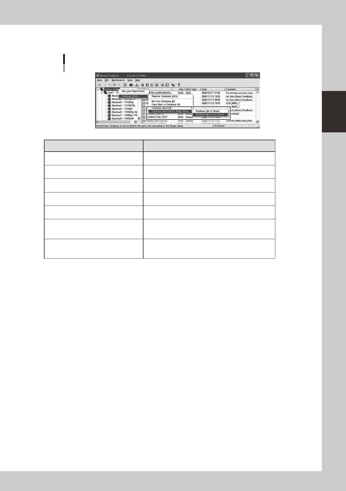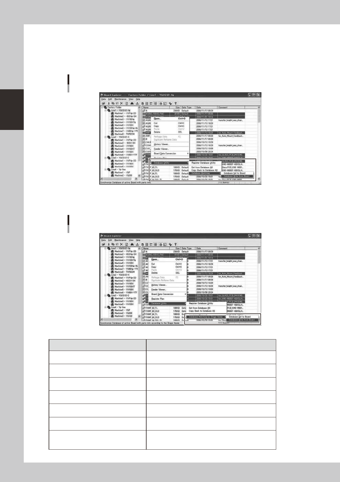 2-55 2 Board Explorer In addition, if ”Shape Database” is set t o “Use” in the Option Setting, the “Database Matching by Shape Name” menu is displayed. Database Matching b y Shape Name menu 64270-S0-00 Items Description …