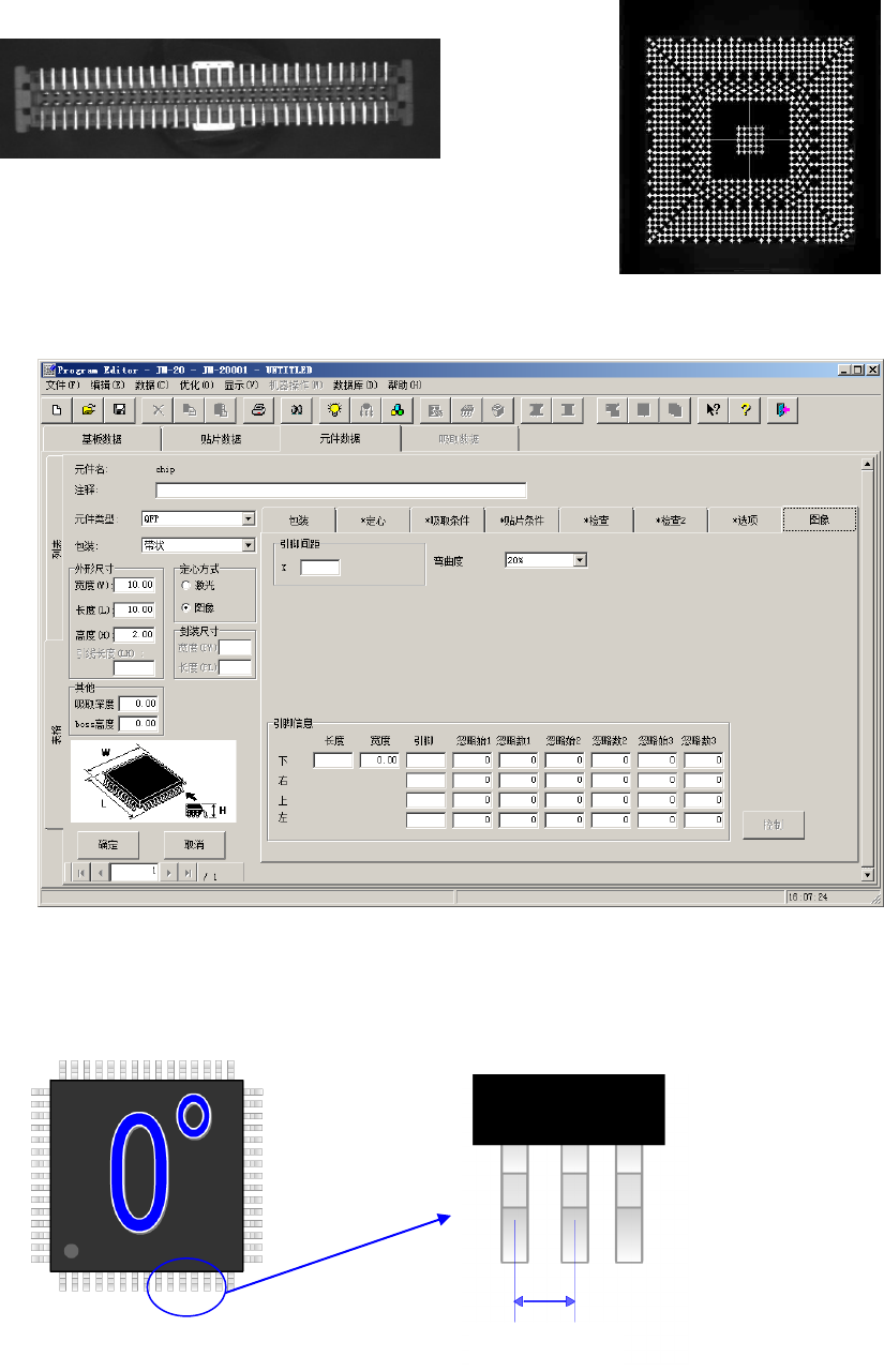 EPU 使用说明书 第 4 章 制作生产程序 4- 103 例 1 ) 连接 器元件时 (引脚识别) 例 2 ) B GA 元件时 ( 球识别 ) (1) 元件类型 引 脚元件时 1) 引脚间距 输入引脚之间的 尺寸。 引脚间距