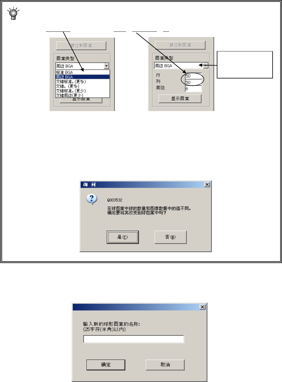 设置周边型 BGA、交叉的周边型 BGA(外围多)、交叉的周边 BGA(外围少)球面图案时,要从周边