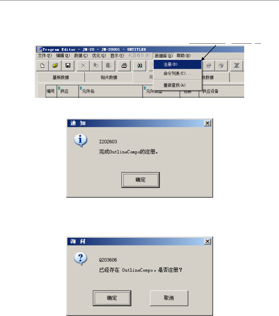 EPU 使用说明书 第 5 章 数据库 5-5 显示如下错误信 息时,表明已经与数 据库的元件数 据建立了关联。 详情请参见元件 数据库的使用说明 书。 把环境设 置的数据库注 册完成通知 设定为 「是」 的情况下, 数据 库注册完成时, 会显 示如下通知。 把环境设 置的数据库注 册完成通知 设定为 「否」 的情况下, 数据 库注册完成时, 不显 示上述通知。 ● 对元件名逐 一进行注册。 ● 注册目标数 据库是指 “ 环境设置 ( …
