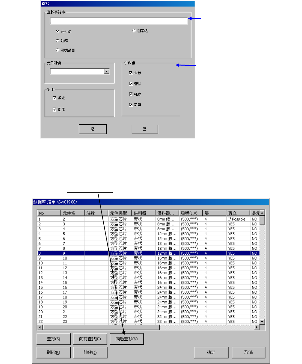 EPU 使用说明书 第 5 章 数据库 5-6 5-1- 3 命令列表 从贴片数据、元 件数据中选择时,在 贴片数据上尚 未输入元件名的状态 下,可 选择命令列表。 元件名已输入的 状态下,则不能执行 。 元件名已经输入 时,显示为不能选择 。 执行方法,请参 见「 5-1-1 数据库使用方法」。 5-1-3- 1 查找 可以查找元件数 据库内的数据。 < 步骤 > ① 从数据库清单 画面,点击 [ 查找 ] 。