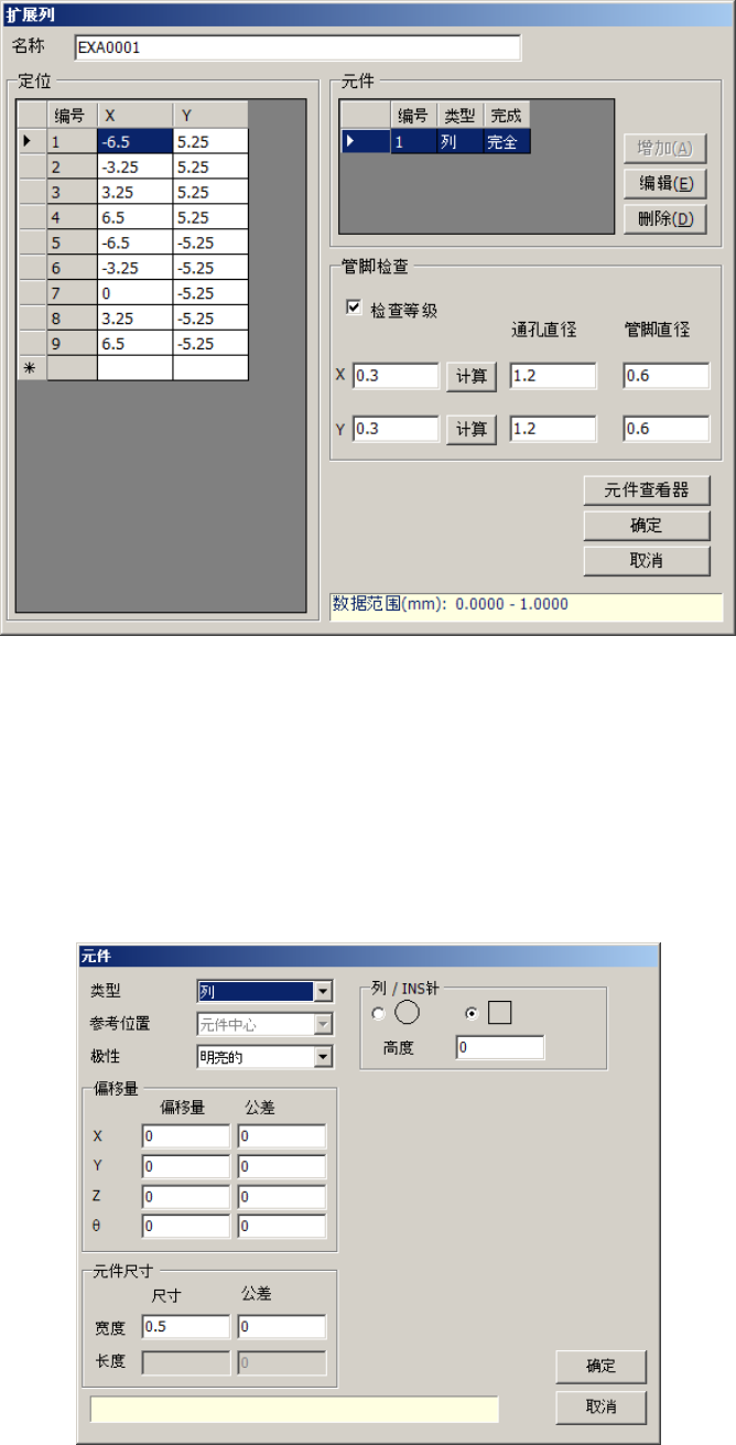EPU 使用说明书 第 6 章 通用图像元件 6- 44 从扩展列画面中 ,按下编辑按钮,即 可打开元件要 素画面。 类型, 选择「列」 或 INS 针。 元件 要素极性 ,选择明亮的。 无需 输入偏移 量 及公差 。 元件 要素尺寸的宽 度 ,输入插入 针(管脚 )的宽度。 在列 /INS 针 中 输入 插入针 ( 管脚 ) 的形状。目视 确认针脚前 端是 圆形、还是 四角形,选择接近的形状 输入。 无需输入高度。