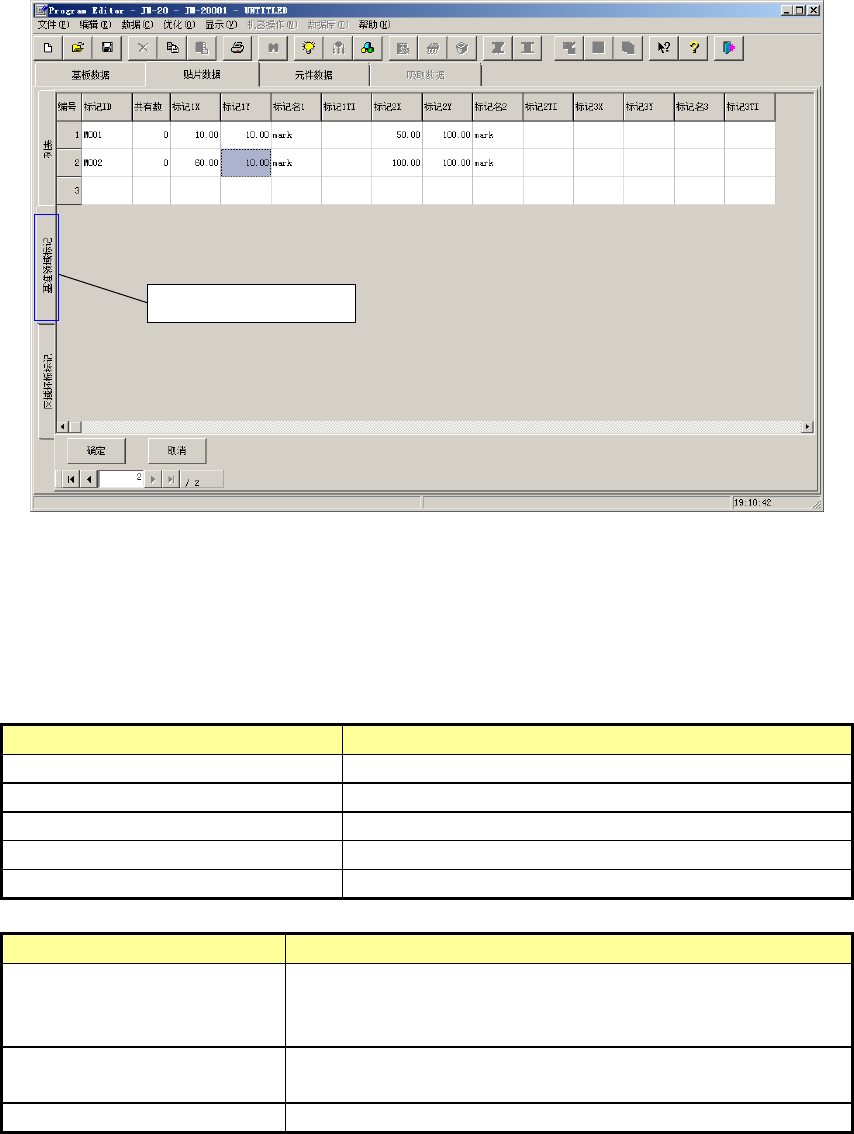 EPU 使用说明书 第 4 章 制作生产程序 4- 38 「画面显示内容」 · 标记 ID : 输入标记 ID 。最多可输入 8 个半角 文字。 省略时将自动分 配。 · 共有数 : 显示当打开区域 标记画面时的,参照标记 群组的贴片数据点数 。 但不能编辑。 · 标记 1(2 , 3 )X : 输入 标记的 X 坐标。 · 标记 1(2 , 3 )Y : 输入 标记的 Y 坐标。 · 标记名 : 输入标记的名称 。 · 标记 1(2 …