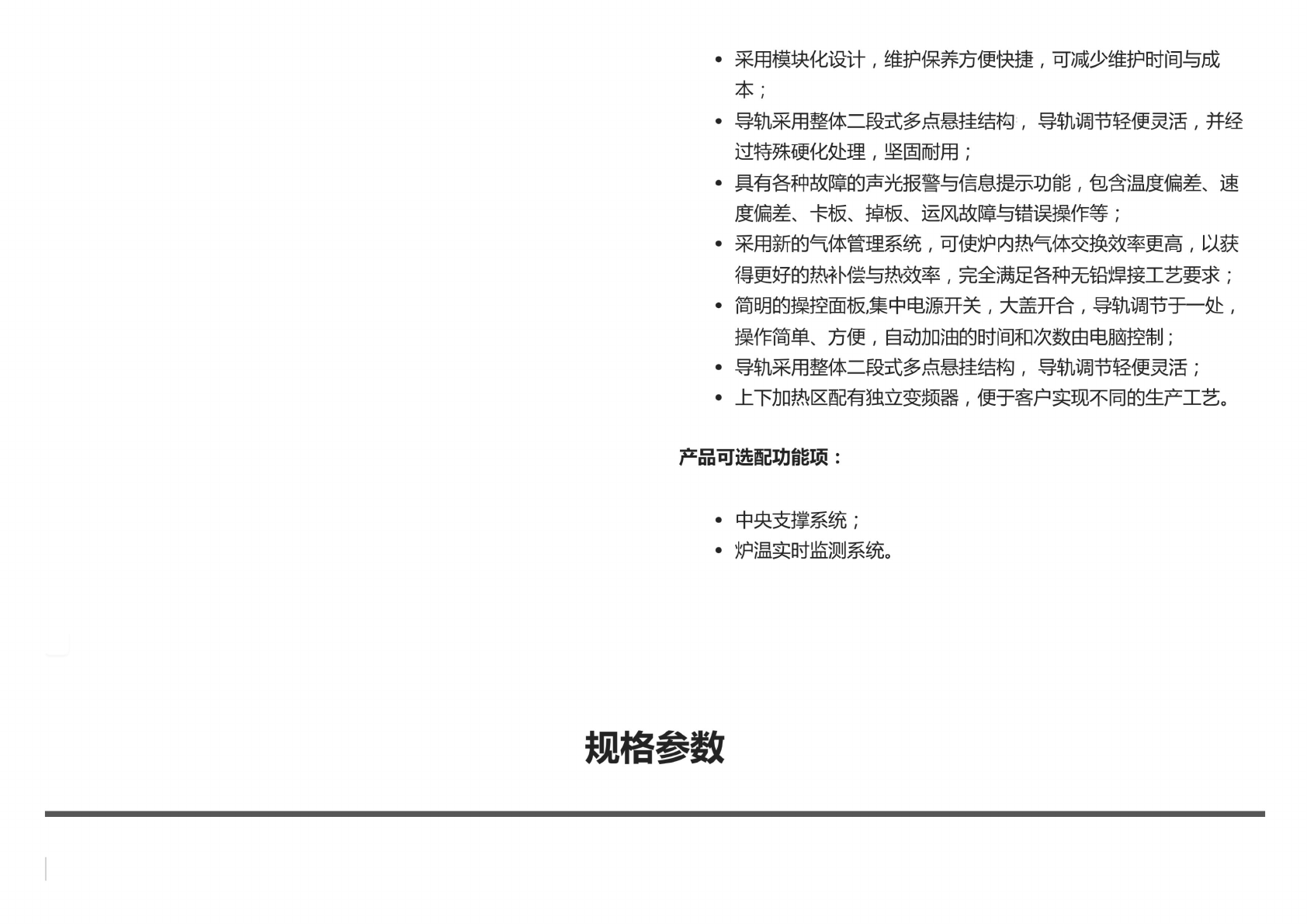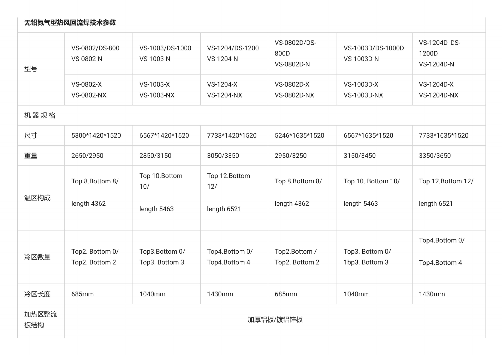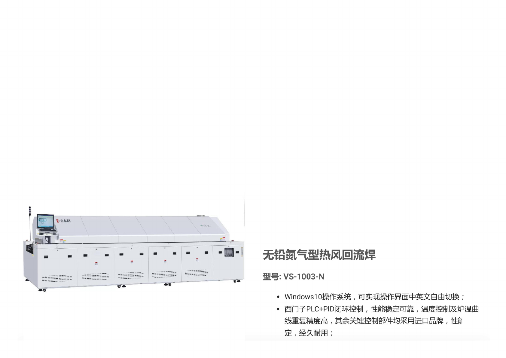 无 铅氮气 型热风 回流焊 型号: VS-1003-N • Windows1 0 操 作系统 , 可实 现操作 界面中 英文自 由切换 ; • 西门子 PLC+PID 闭环 控制, 性能稳 定可靠 , 温度 控制及 炉温曲 线重复 精度高 , 其余关 键控制 部件均 采用进 口品牌 ,性自 定 ,经 久耐用 ;