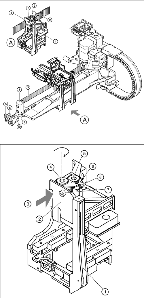 ► Lösen Sie beide Innensechskantschrauben M6 x 10 (7) und entfernen Sie die Umlenkeinheit ’X’ (8).