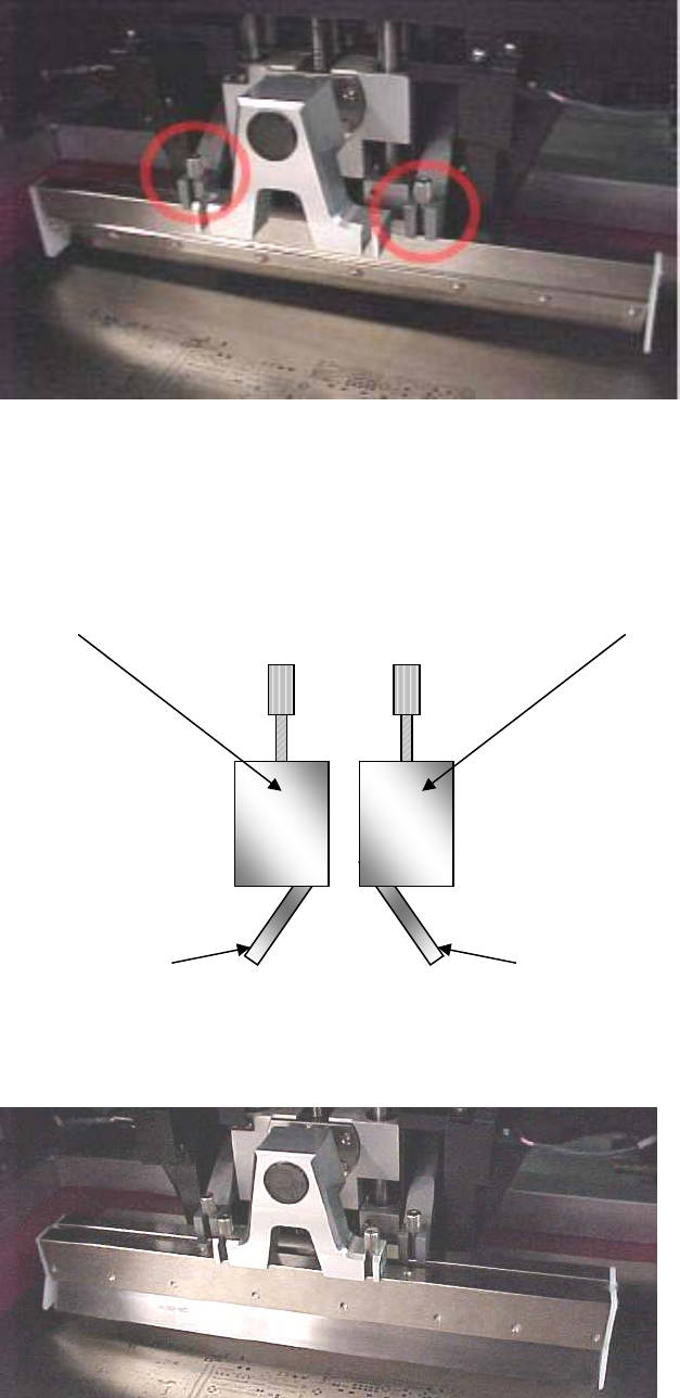 5-HR90-7000-011 Page 28 of 51 12. 印刷机設置 • 首先決定刮刀裝入的順序 . • 帶最遠的螺絲的刮刀始終第一個裝入 . • 后刮刀將從机器的后面印向前面 , 這稱為 前至后印刷 . 為了完成這個動作 , 刮 刀必須以正确的方向插入 . • 當后刮已被固定 , 插入前刮 . 如下圖 . 后刮 前刮 注意后刮面朝向印网的 后面 注意前刮面朝向印网的 前面