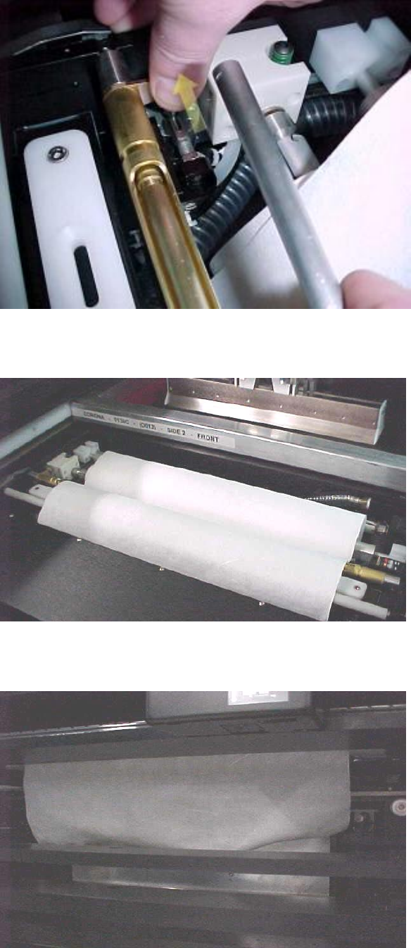 5-HR90-7000-011 Page 45 of 51 14. 填充擦机紙 • 擦紙必須首先經過金屬條的下面 , 通過拉控制杆向左可以將金屬杆取出 . • 向机器前面拉擦机紙通過溶劑槽 , 真空柵 , 白色滾筒 . • 擦机紙穿過擦机單元下面和兩個白色滾筒周圍 .