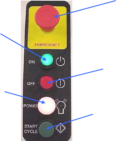 5-HR90-7000-011 Page 8 of 51 9. 机器部件 • 控制面板 • • 緊急開關 • 看第 8 章 – 安全事項 • 開電源按鈕 • 按下開電源按鈕 , 電源繼電器按通供電給机器部件 . 此時電源指示 燈亮 . • 關電源按鈕 • 按下關電源按鈕切斷机器部件電源 , 此時電源指示燈熄滅 . • 電源指示燈 • 當交流電源接通時電源指示燈會亮 , 這時主斷路器應在 ON 的位置 . • 開始周期 • 有兩個開始周期…