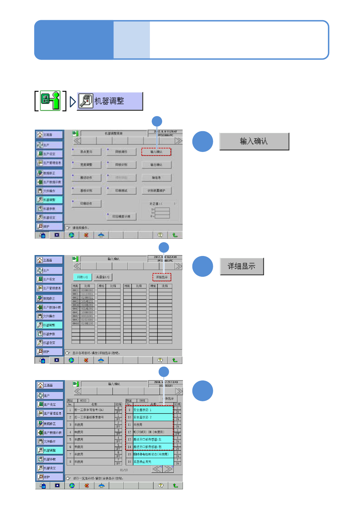 SPG EJP6AC-MB-0 3MM-03 每 560 小 时保养 保护盖安全开关的检查 使用工具:不要 所要时间: 15 分钟 1 ●打开安全盖,确认画面上的 No.9 “安 全盖状态 1 ”、 No.10 “安全盖状态 2 ” 从蓝色转为灰色。 ●关闭安全盖 , 确认上述显示是否从灰色 变成蓝色。 2 维修保养篇 3-4-8 3 检查安全开关 1 2 3 3-4-8 -1