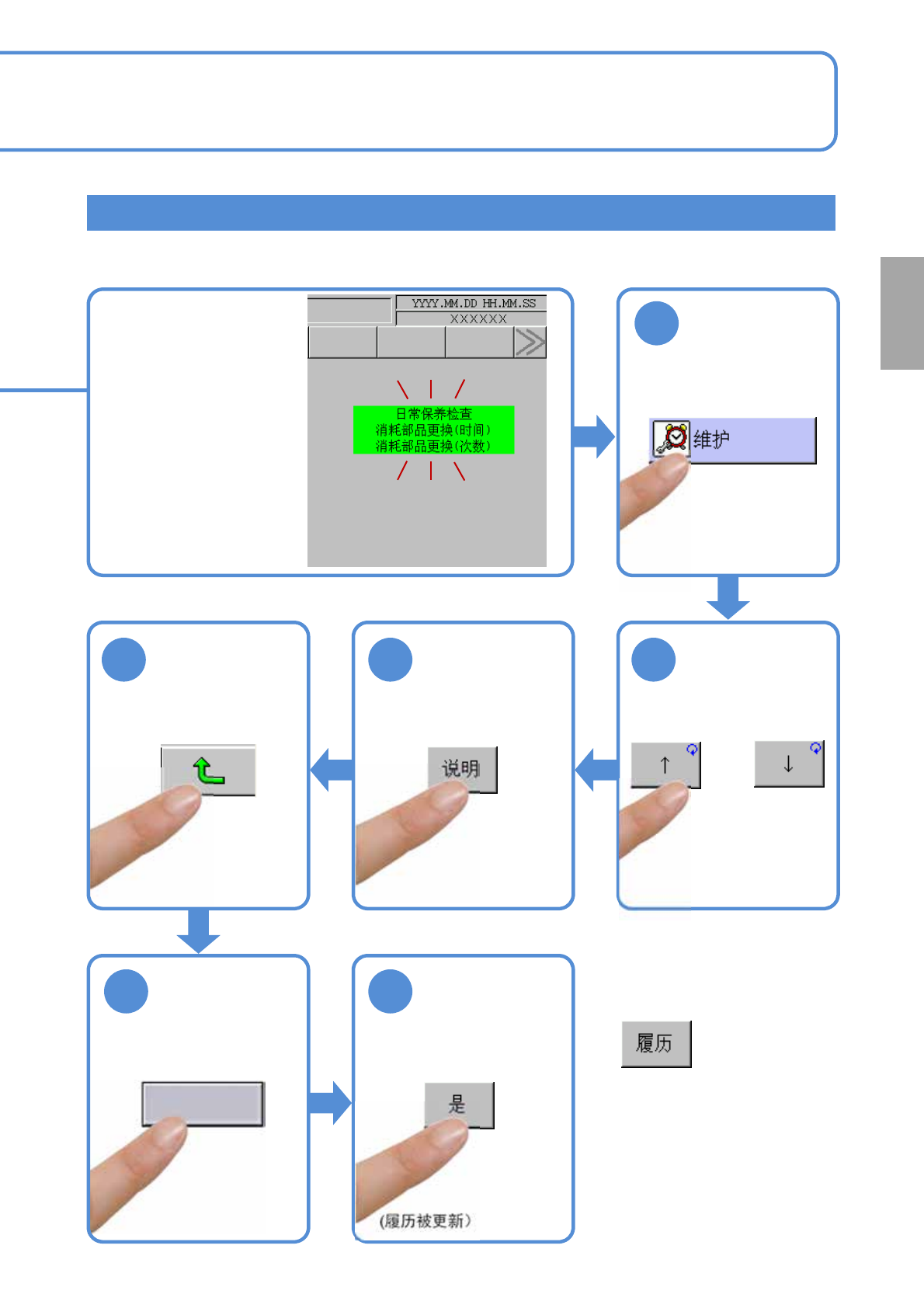 SPG EJP6AC-MB-0 2MM-02 维修保养作业 概要 维修保养的概要 事先设定的周期和运转时间 , 自动计算出定期维修保养的时期 , 并发出通知。 维修保养后输入结束 , 作业日期作为履历被保存。 这个数据作为计算下次维修保养时期的计算基准。 设备 画面 作业 前次维修保养后 的运转时间累计 通常显示 经过了 1 个周期的 90% …… 绿色闪烁 显示项目 确认作业内容 黄色闪烁 显示项目 周期过后…… 更新履历 通常显示 …