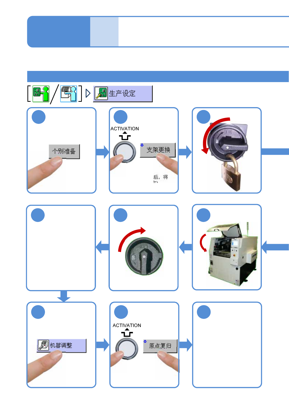 SPG EJP6AC-MB-0 4MM-02 4-1-6 -1 基板传送皮带的更换 1 基本定位升降机的基板传送皮带的更换 使用工具 : 无需 所要时间 :10 分钟 3 2 1 ( 退避网板清洁单元后,将 Y 工作台移动到前方 ) 9 10 切换到工程师模式 ( → “操作篇”的 P.2- 1-3) 11 12 确认基板搬送 ( → “操作篇”的 P.5- 1-3) ON 取下锁头 13 更换 维修保养篇 4-1-6 8