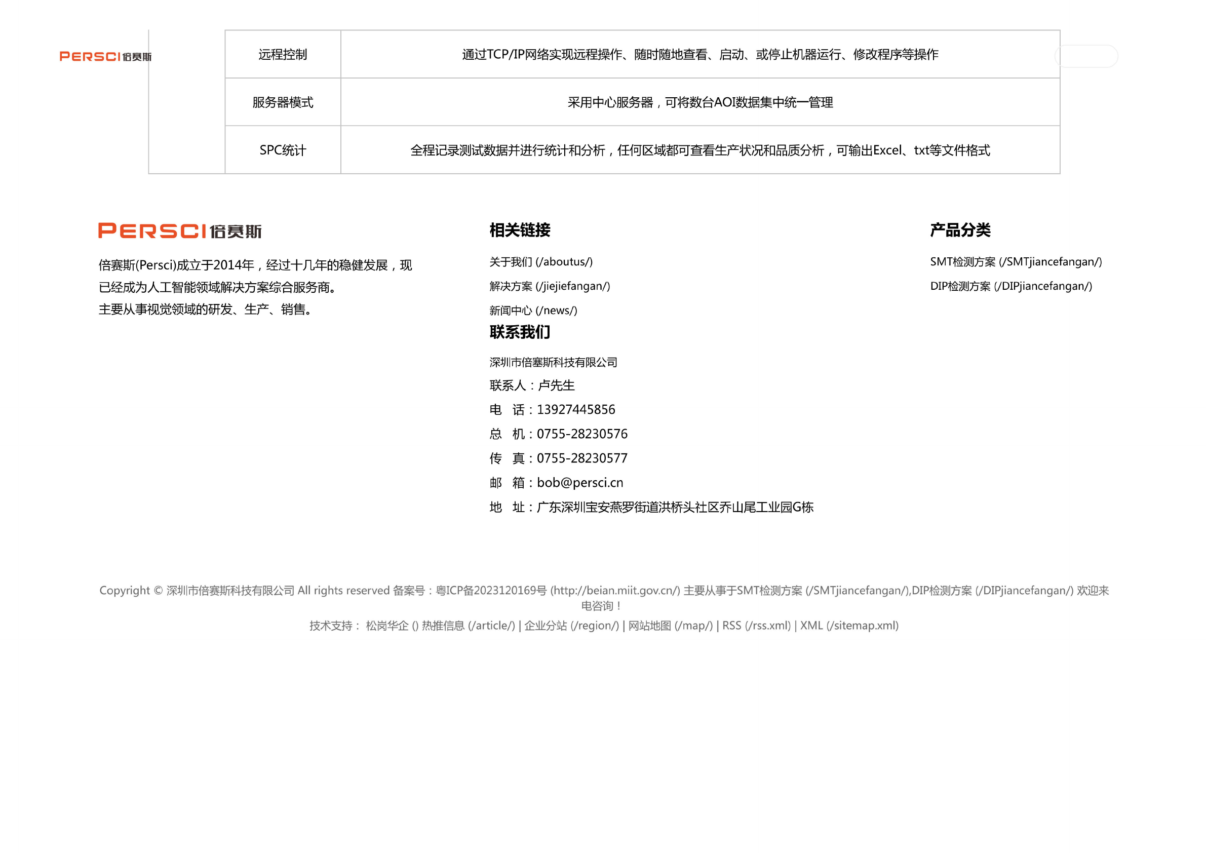 PER 5cl 后良斯 远 程控制 通过 TCP/IP 网络实 现远程 操作、 随 时随地 查看、 启动、 或 停止机 器运行 、修 改程序 等操作 服务 器模式 采 用中心 服务器 , 可 将数台 A0I 数据 集中统 一管理 SPC 统计 全 程记录 测试数 据并进 行统计 和分析 ,任何 区域都 可查看 生产状 况和品 质分析 , 可输出 Excel、 txt 等文 件格式 PERSCHB^nn 倍赛斯 (Persei) 成立于 …