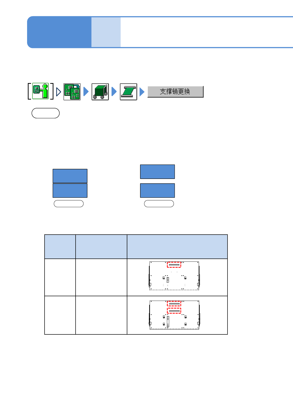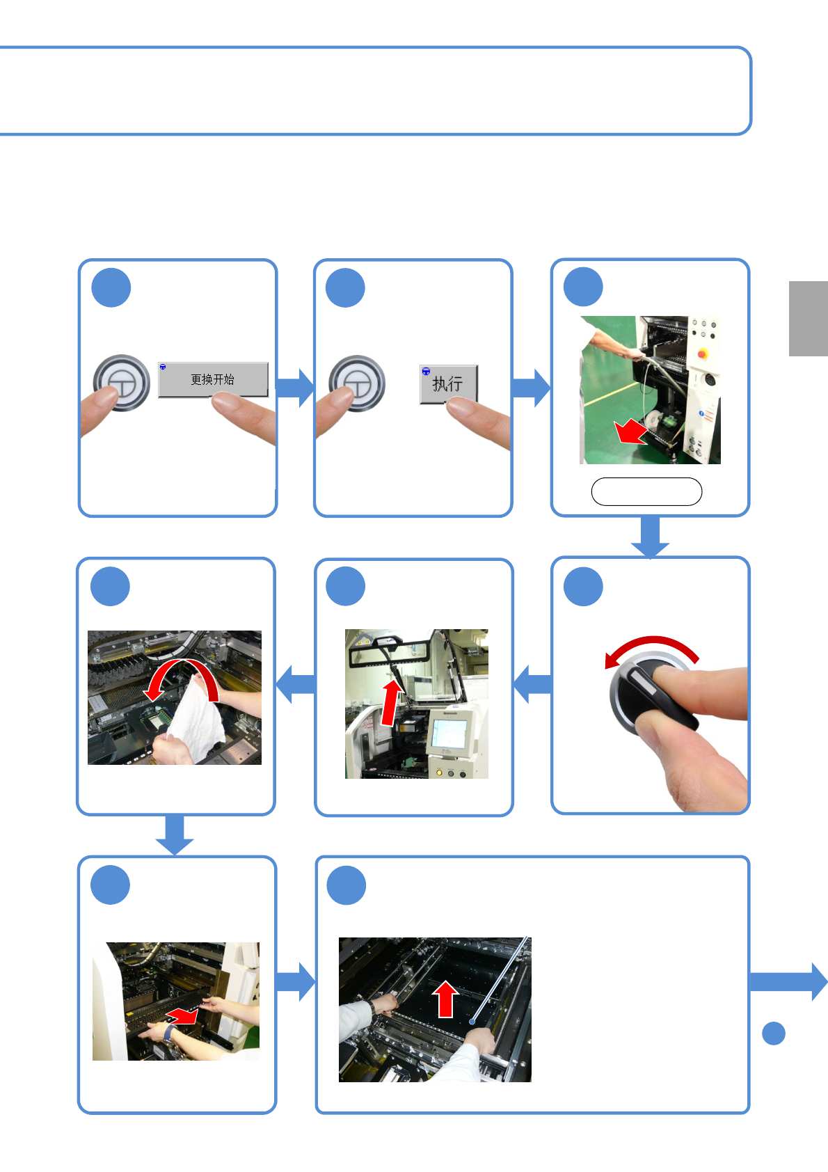 NPM-D3 EJM6DC-MB-05M-08 基板支撑块 ( 自动更换用 ) ( 选购件 ) 的清扫 1 5-3 -1 在这里对基板支撑块 ( 自动更换用 )( 选购件 ) 的清扫进行说明。 使用工具 : 棉纱布等 双轨传送带所需时间 :10 分钟 ●基板支撑块和基板座上如果有灰尘 ,是造成基板支撑块安装不良、 基板破损的原因。 注意 随单轨模式和双轨模式的不同,后侧 的支撑板的配置也有异。 ( 参照下图 ) 在变更轨道模式时,一定需…