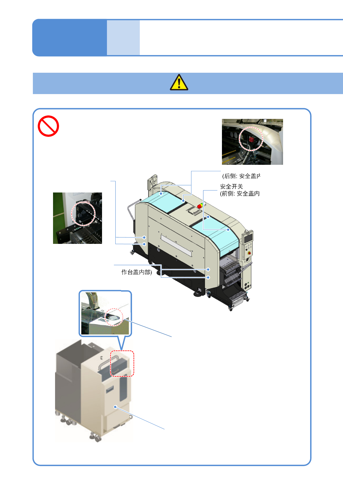 NPM-D3 EJM6DC-SF-01N-1 1 安全开关 ( 后侧 : 供料器工作台盖内 部 ) 1-1 -3 补给部开闭开关 ●有安全开关功能 ●设置在安全盖内 安全开关 ( 托盘箱门内 ) 单式托盘供料器 安全开关 ( 前侧 : 供料器工作台盖内部 ) 安全开关 ( 后侧 : 安全盖内部 ) 安全开关 ( 前侧 : 安全盖内部 ) ●在运转中若检测出安全盖的安全开 关, 会停止运转。 请勿将安全开关 设定为无效 ( 可能受伤 ) …