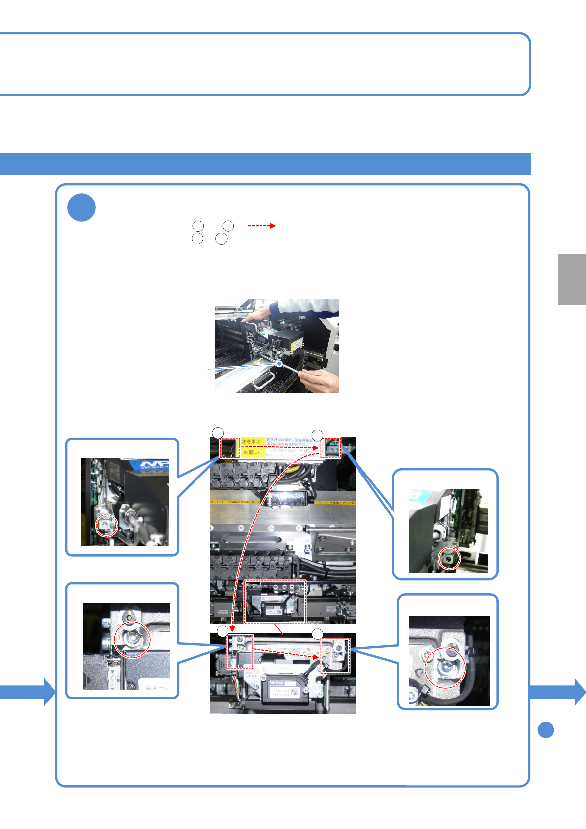 NPM-D3 EJM6DC-MB-11M-07 11 - 1 -8 更 换 5 1 3 4 2 贴装头右下部 贴装头右上部 贴装头左上部 贴装头左下部 长钻头 以固定螺栓暂时紧固贴装头 ●使用长钻头,按照 ~ () 的顺序暂时紧固固定螺栓 (4 处 ) 。 ●暂时紧固固定螺栓 、 时,在连接了连接器的状态下,将 贴装头按压到贴装头托板上的同 时实施紧固。 ●如果按照错误的步骤实施了作业, 有可能会导致固定螺栓或者塞孔 发生破损。 1 4…