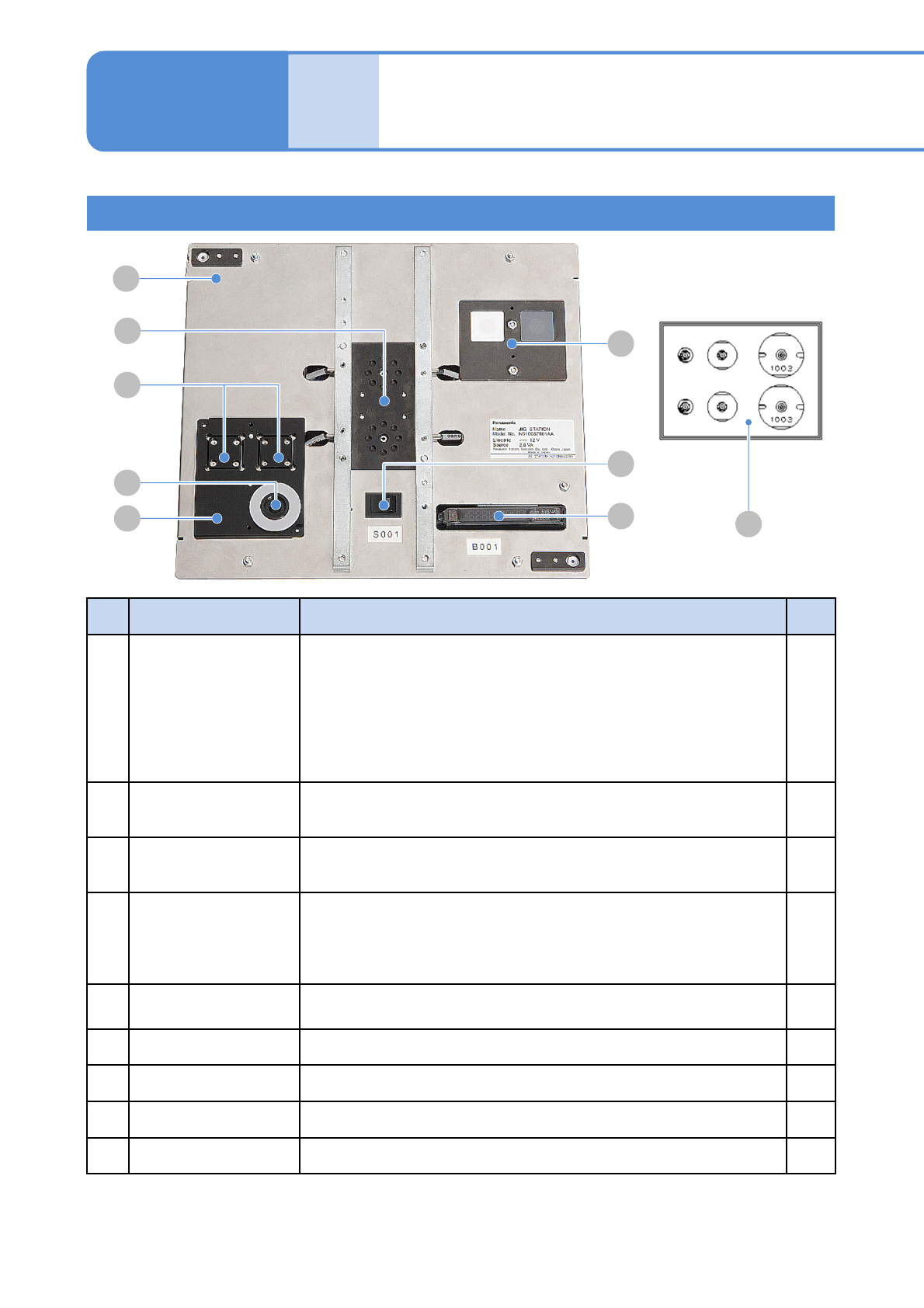 NPM-D3 EJM6DC-MB-13M-06 治具站的构成 No. 单元名称 功能 数量 A 治具站 在更换贴装头等作业时,是用于对贴 装头的参数进行校准的单元。可 用于全部贴装头。 电源规格 : DC12 V (5 号干电池 8 个 ) 请客户准备。 ( →P .12-3 蓄电池的更换) 注意 在电池放置其中的状态下长时间不使用,有可能 造成漏液 , 长时间不使用治具站时,请将电池取 出保管。 重量 : 1.5 kg 尺寸: 2…