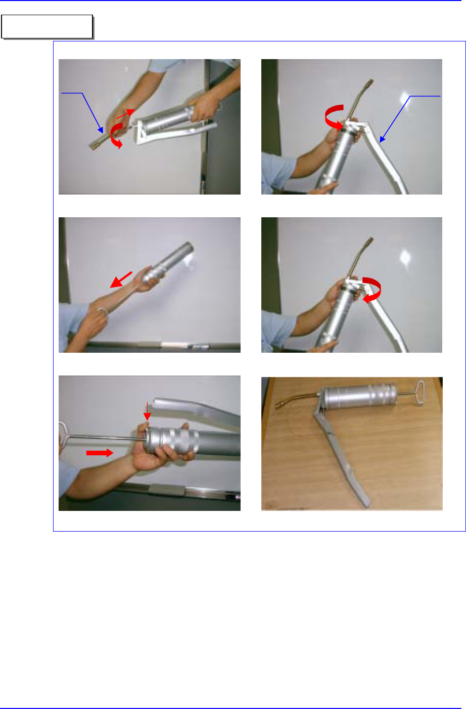 Pr eventive Maintenance 1-7 How to use a grease gun Æ Join the grease nipple and the body . Separate the cylinder and the handle. Æ Pull the cylinder back and fill with grease. Put the handle back. Æ Push the cylinder sl…
