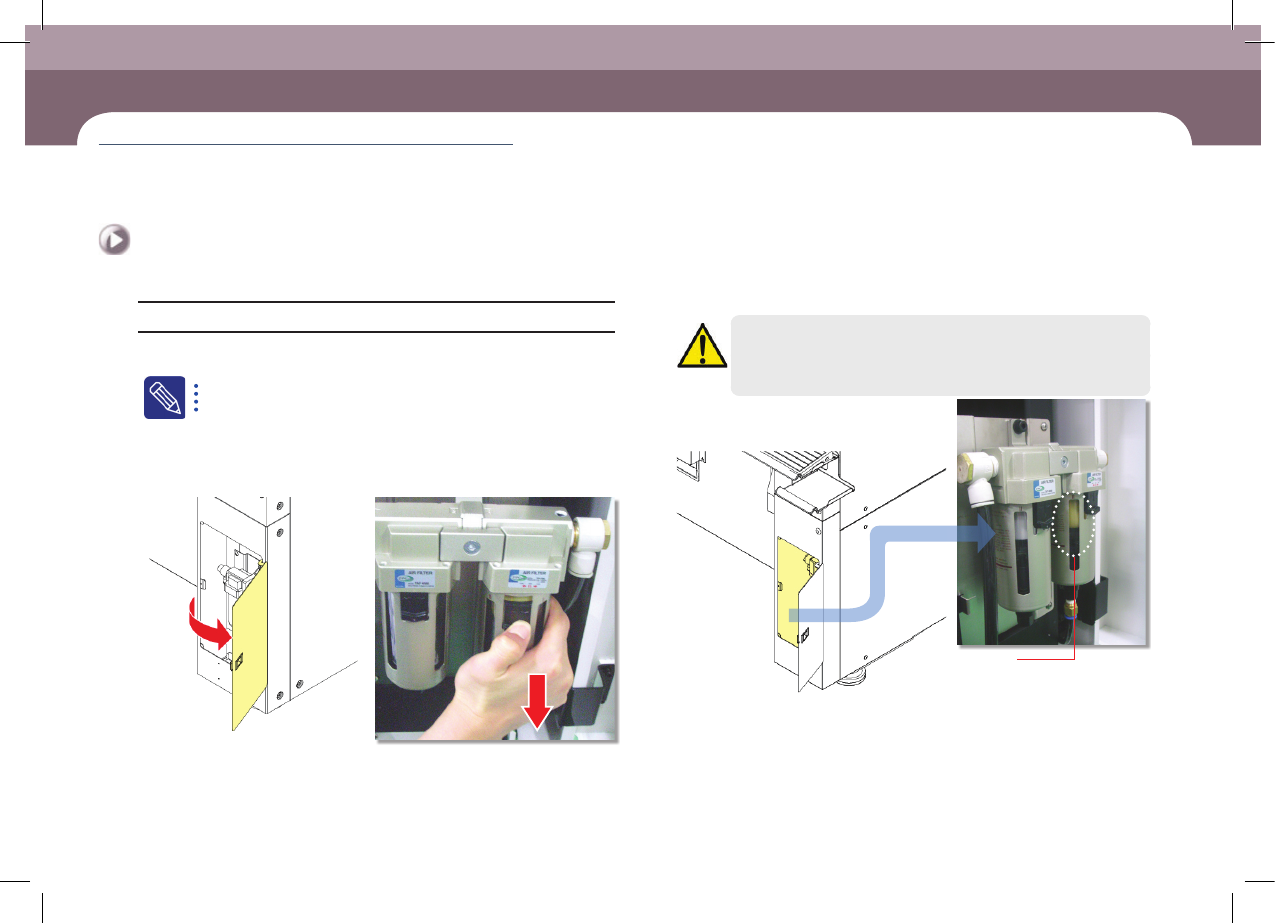 Step 3. 打 开 设 备 背 面 右 下 角 的 护 门 后 、拉 下 Mist Filter容器闭锁按键