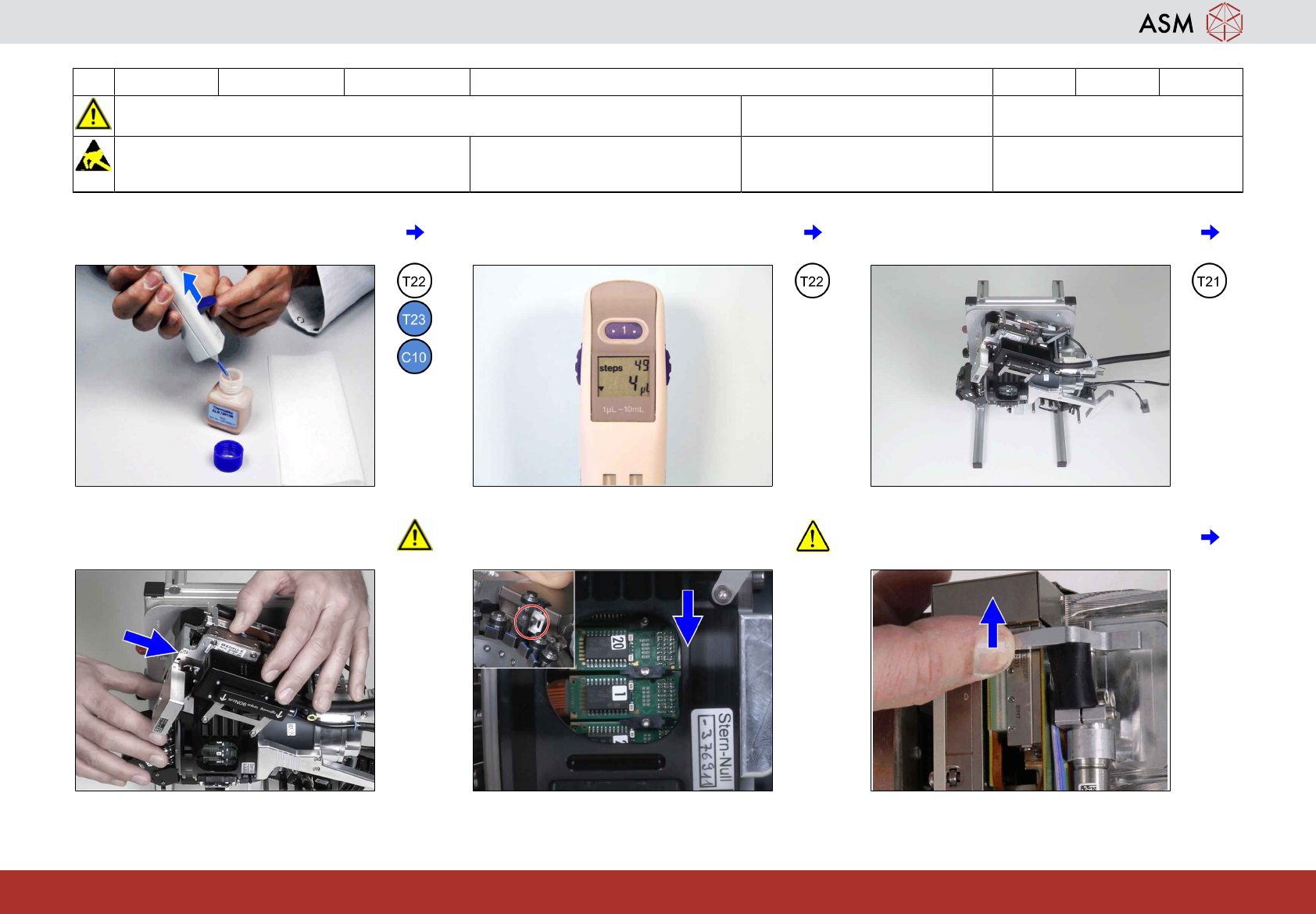 5 3-monthly C&P20 P2/M3 清洁/润滑 Z 轴线性引导装置 6 分钟 y 1 / 5 开始维护前,请参阅用户手册中的安全说明 注意!遵守防静电守则 工具 T7、T21-T23、T47、T77、T96-T98 易损件: 耗材: C10、C22 www.asm-smt.com 1 准备分液器。参见“准备分液器”附录。 2 转动转轮,调整到 4 µl。 3 将贴片头调整到倒立位置直到 Z 轴与侧边 呈 45° 角。…