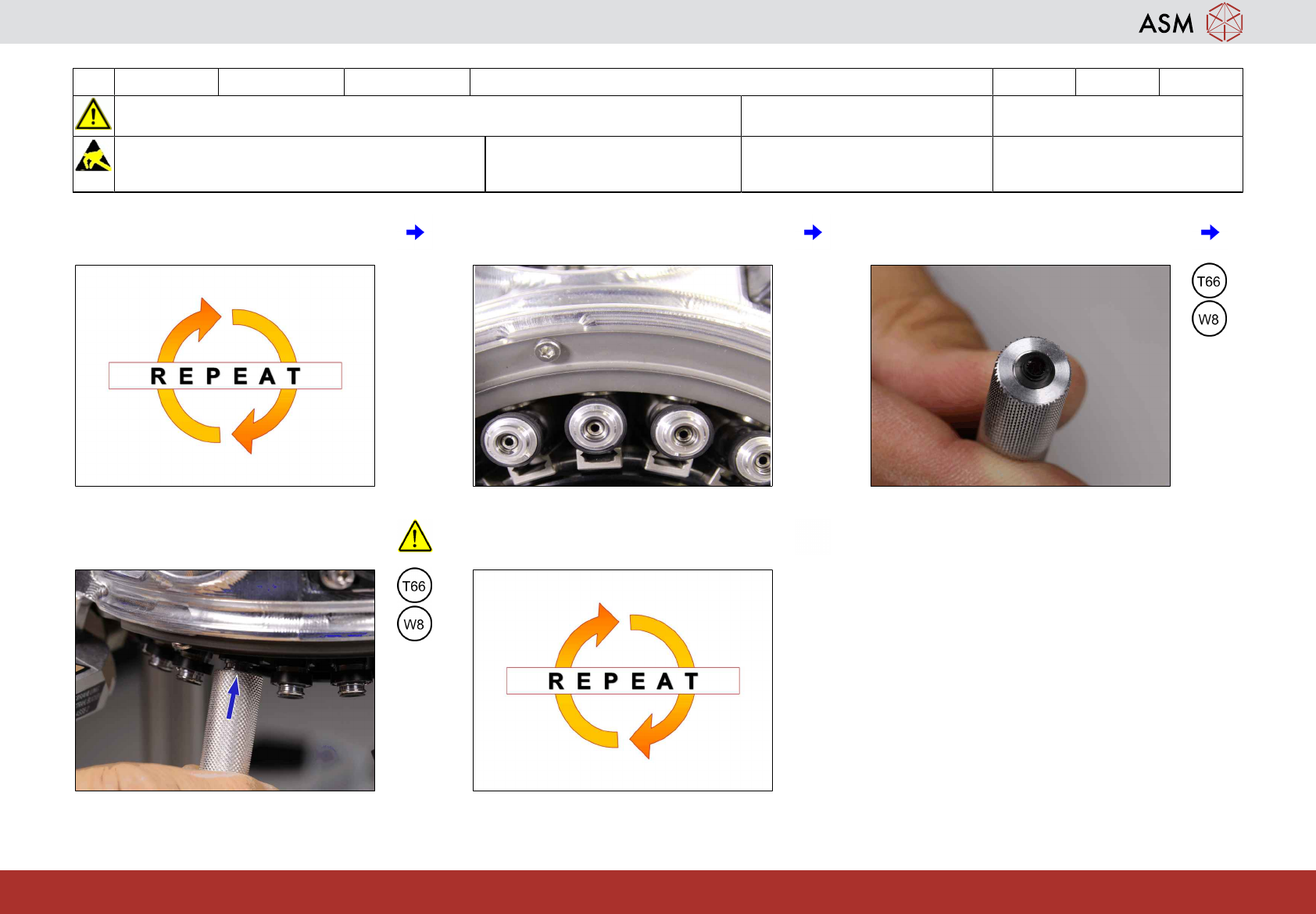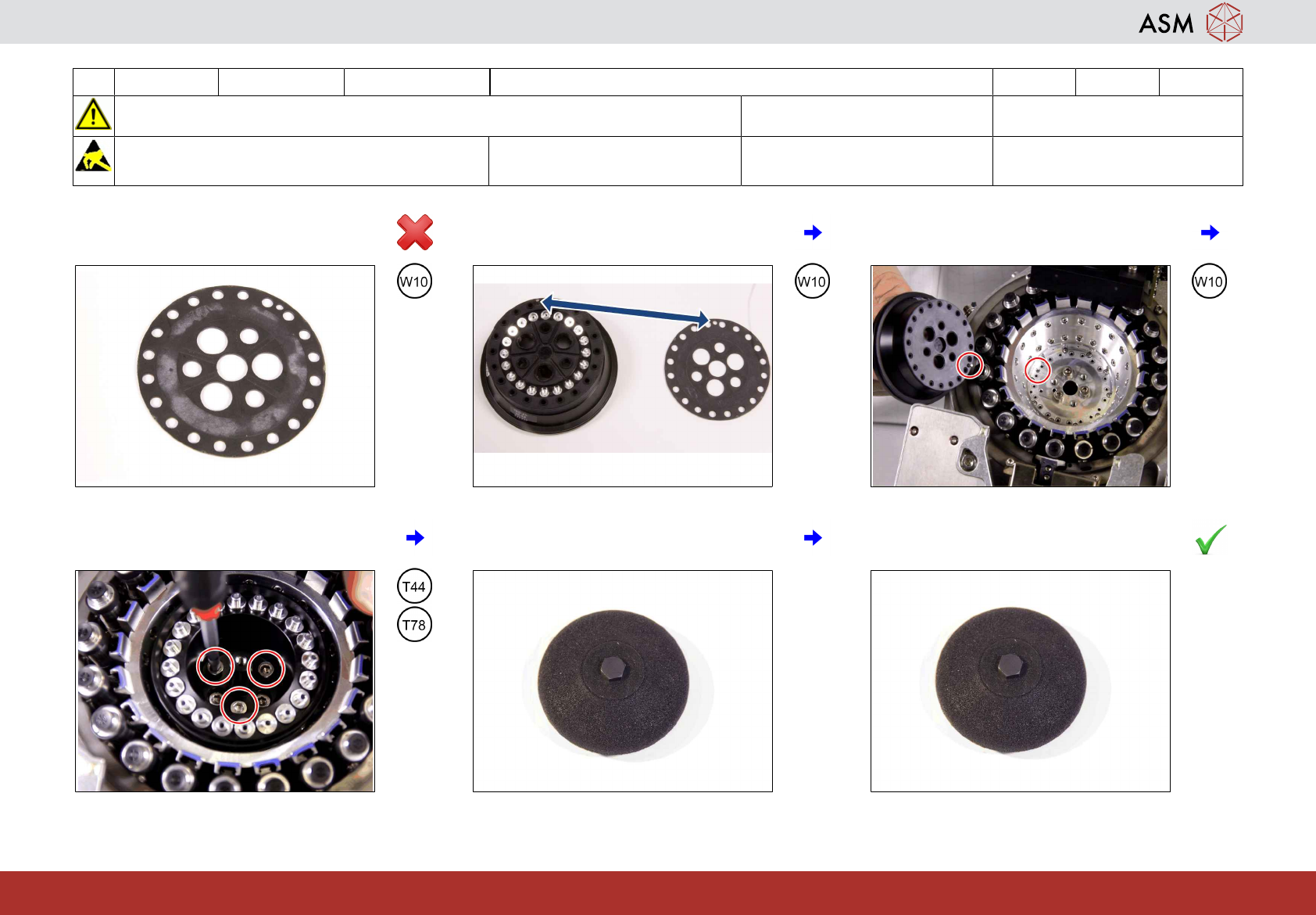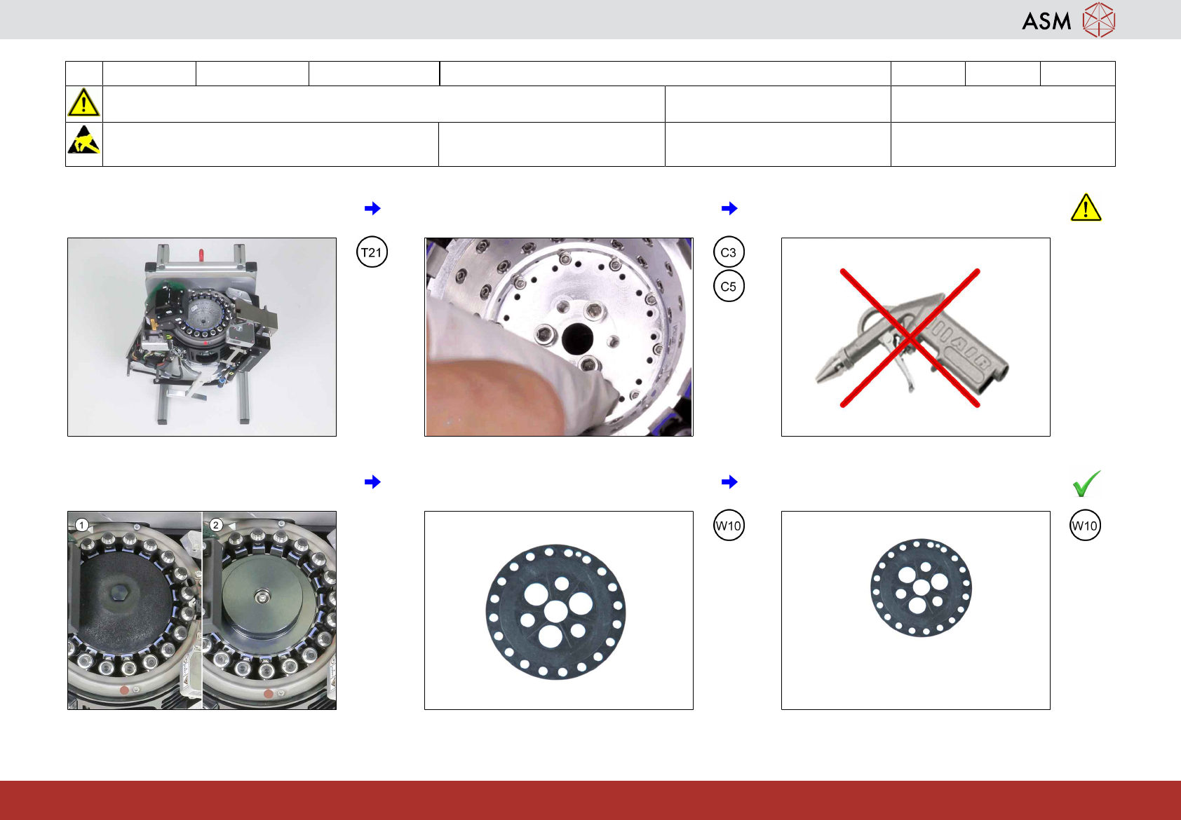 11 3-monthly C&P20 P2/M3 安装保持回路/孔板 8分钟 1 / 4 开始维护前,请参阅用户手册中的安全说明 注意!遵守防静电守则 工具: T21、T44、T78 易损件: W10、W18 耗材: C3、C5、C11、C22 www.asm-smt.com 1 将贴片头倒转过来。 2 清洁保持回路/孔板的底座。 3 切勿使用吹气清洁底座,否则可能会吹落 连接至 DP 的软管。 4 要安装保持回路 (1),请执…