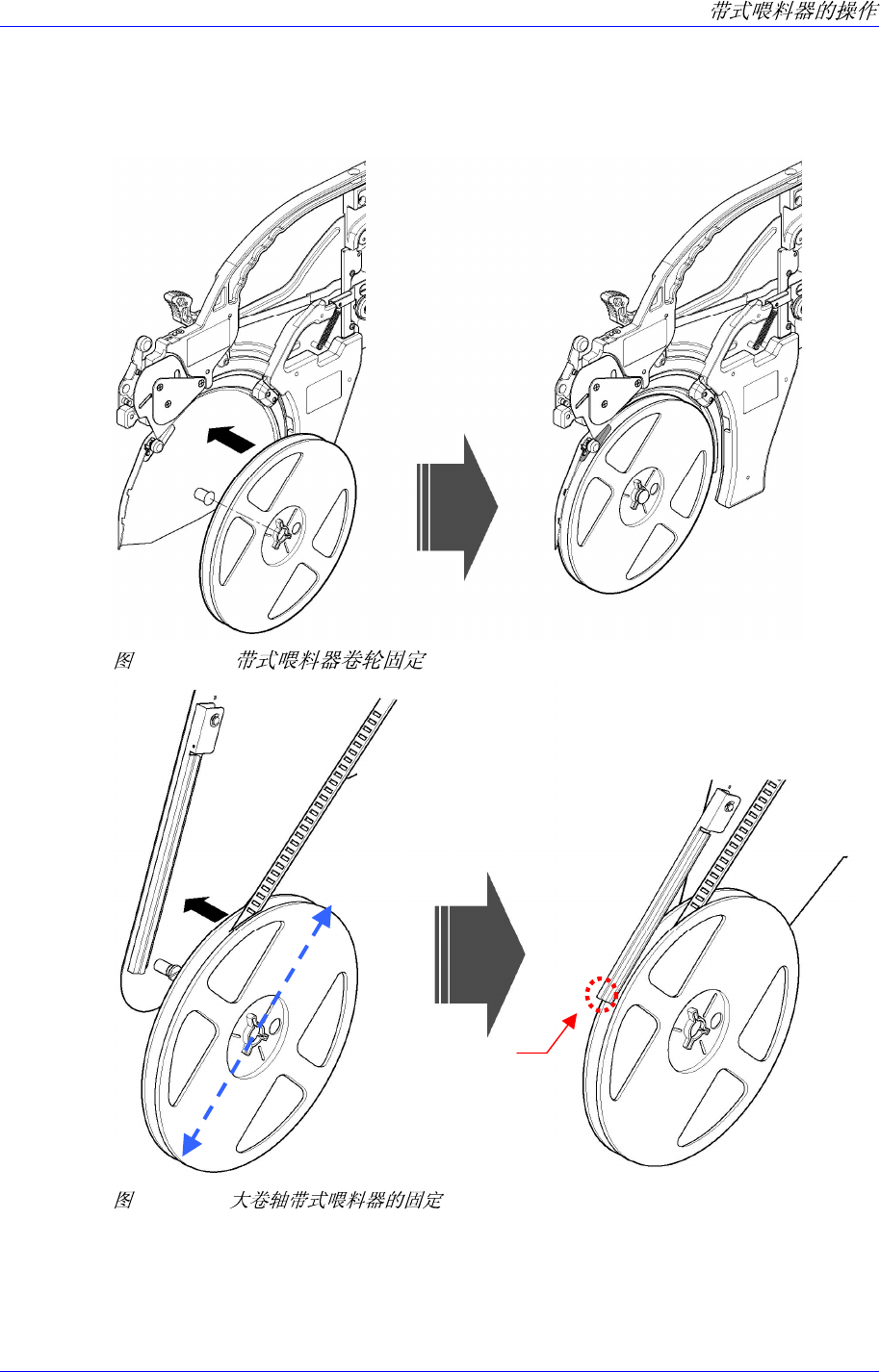 注意卷带方向如下图所示固定卷轮。 8mm带式喂料器使用料带卷盘制动器固定卷